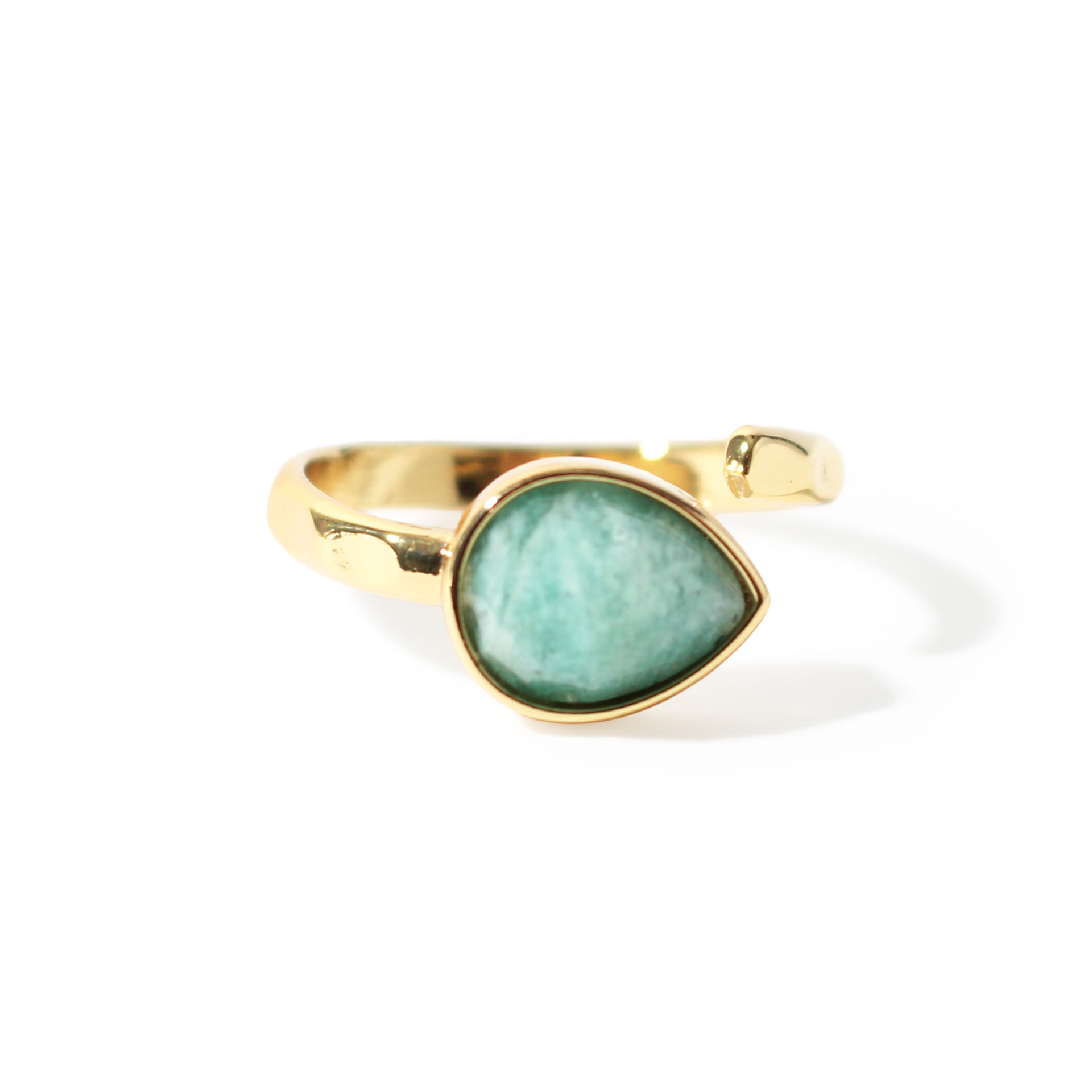 This Amazonite Faceted Drop Ring showcases a soft blue-green teardrop stone with delicate faceting, set on an adjustable band for a comfortable, custom fit. Calm and refreshing, it adds a serene touch to any outfit.