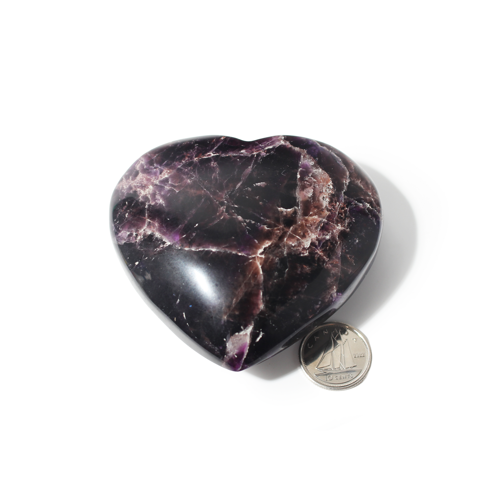 This Amethyst Dark Heart #5 ranges from 2" to 3" and features deep, rich purple tones with a smooth, polished finish. Bold and soothing, it radiates protective, high-vibe energy in a heart-centered form.