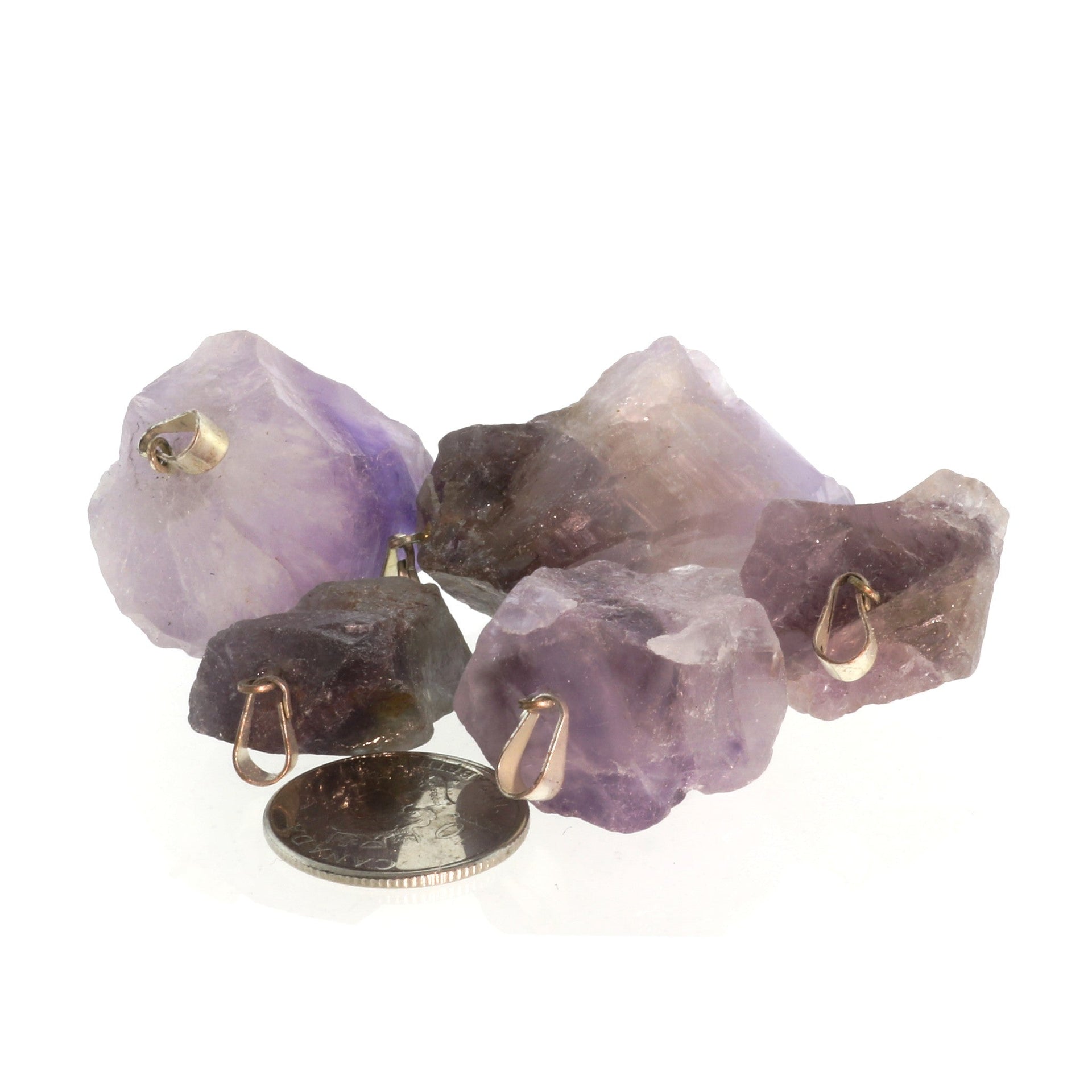 Subtle yet charming, These small rough Amethyst stones come in a bag of five and are adorned with a silver metal bail. With these pendants, you can create a stylish look for your jewellery.