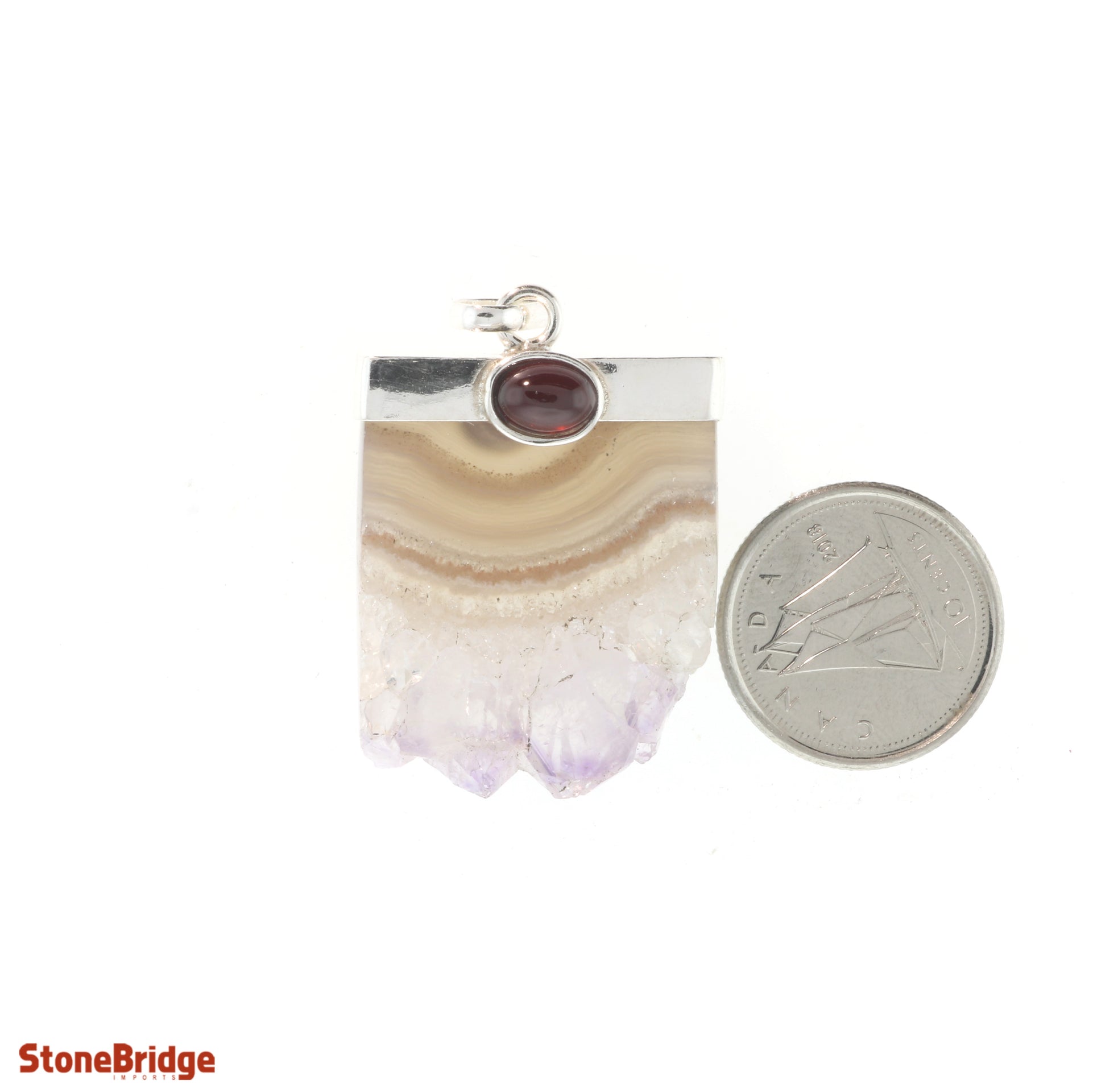 A beautiful amethyst cluster slice set on a sterling silver bail, displaying layers of quartz crystals exhibiting the formation process.