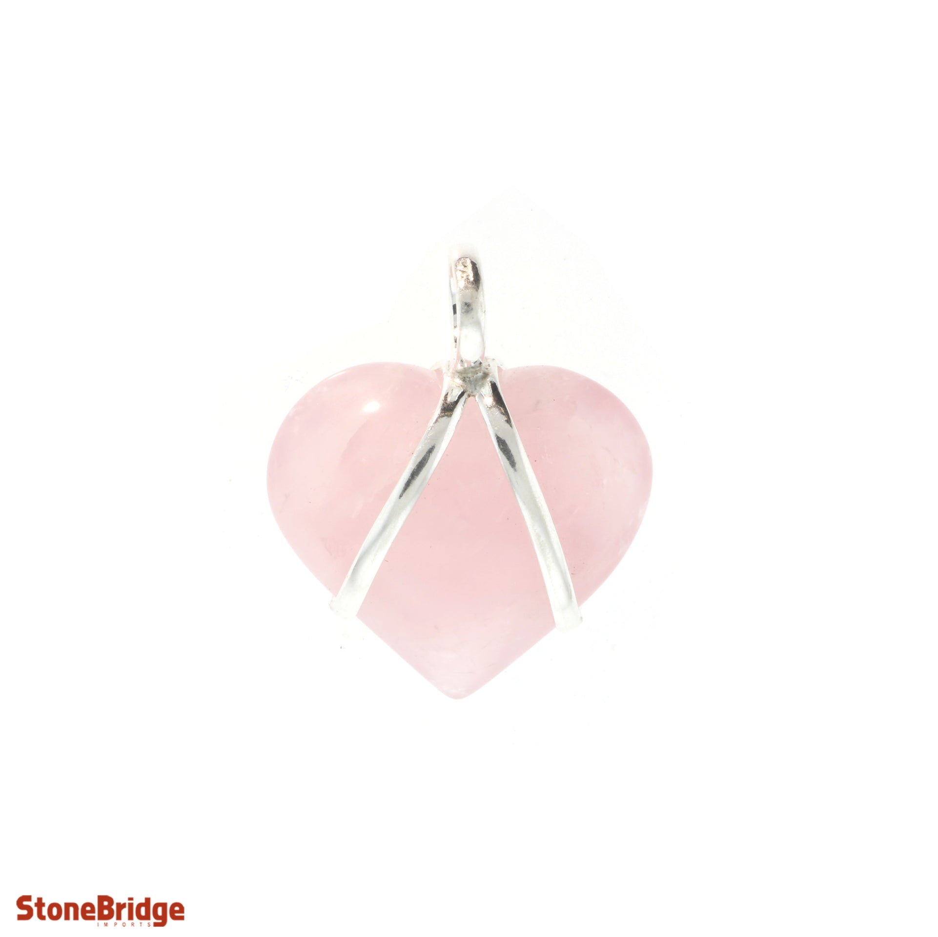 A polished Rose Quartz heart is set in a sterling silver bail with a V-Set wrapping.