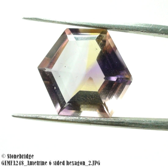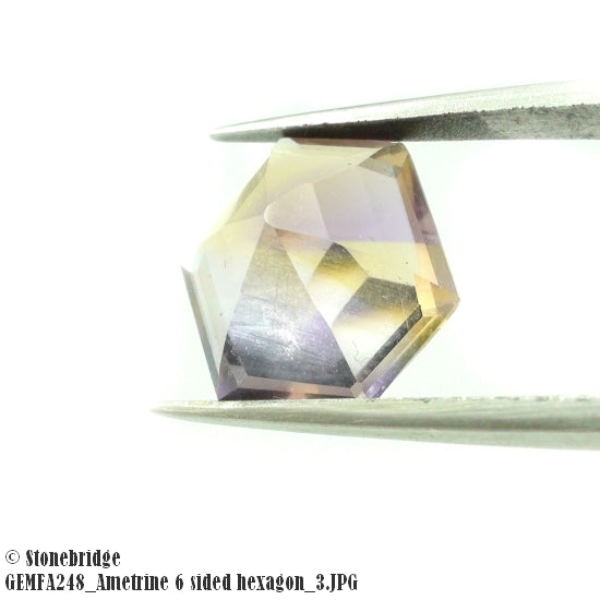 Ametrine 6 sided hexagon All hand faceted by talented artisans in Brazil. Perfect for jewellery making, wrapping and gemstone collections! Unique products brought to you by The Rock Space. Weight: 12ct Length: 1.5cm Width: 1.8cm Depth: 0.8cm