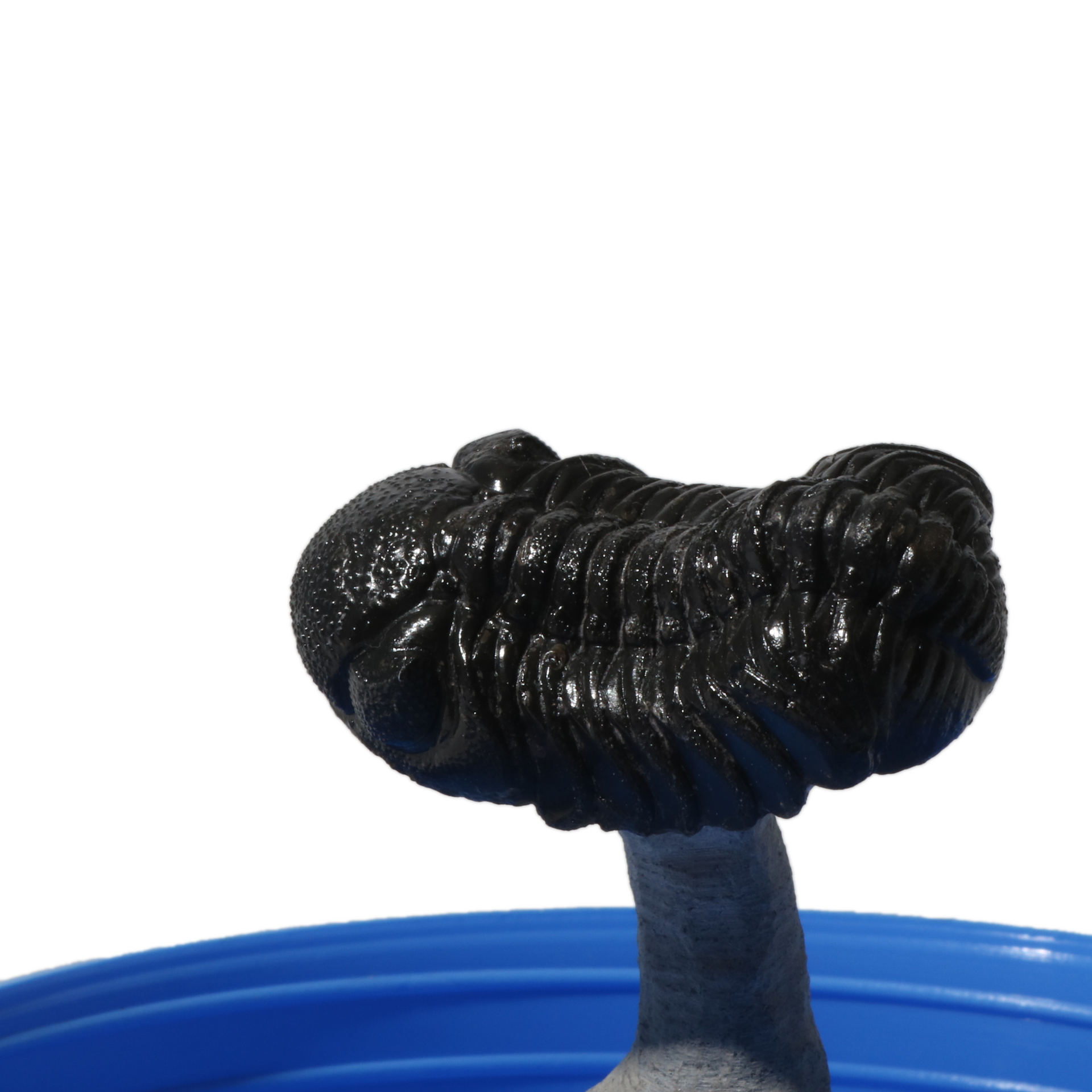 Trilobites are among the earliest known arthropods, and their fossils are highly prized for their detailed preservation and historical significance. This particular specimen is showcased in striking black, highlighting its intricate exoskeleton and natural symmetry.