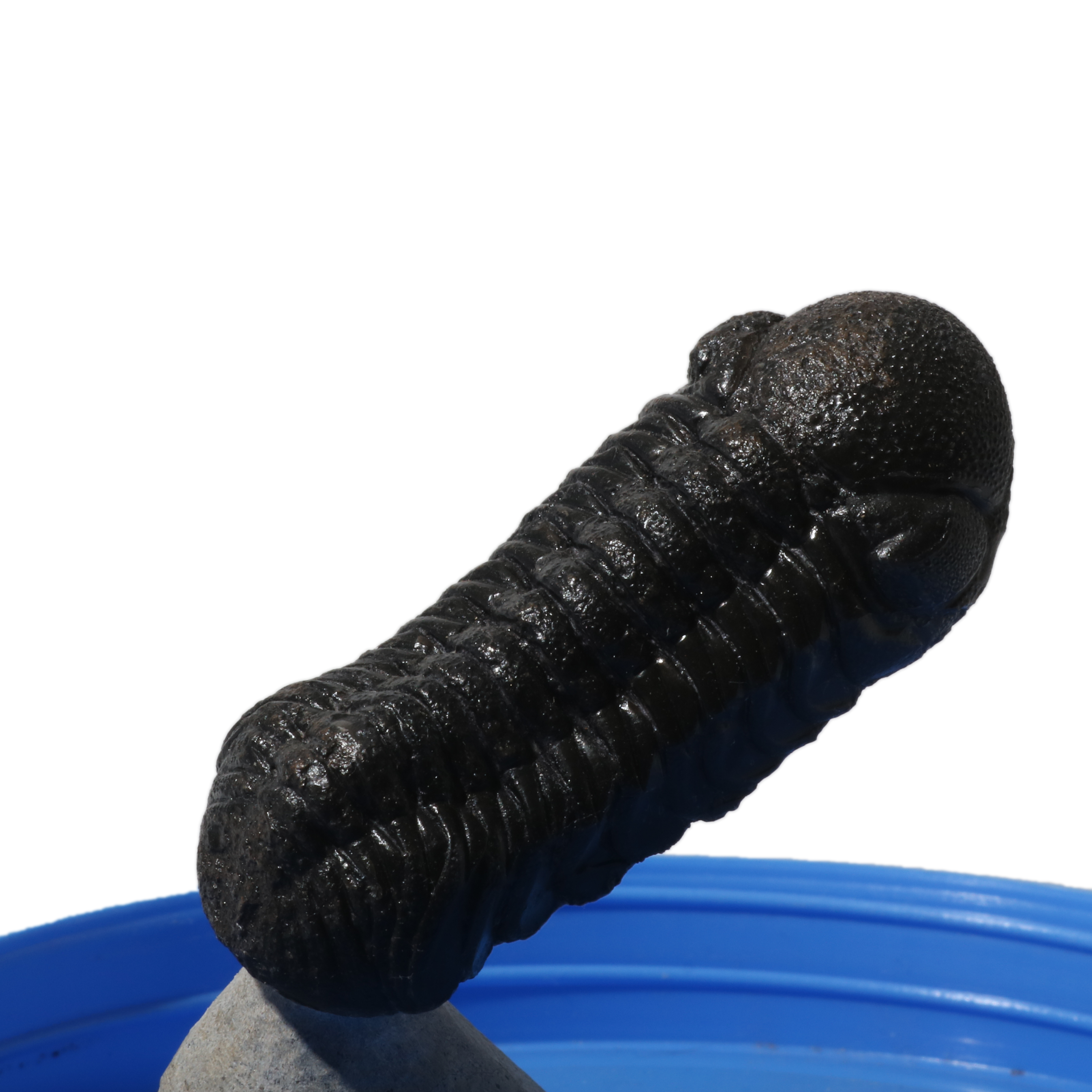 Trilobites are among the earliest known arthropods, and their fossils are highly prized for their detailed preservation and historical significance. This particular specimen is showcased in striking black, highlighting its intricate exoskeleton and natural symmetry.