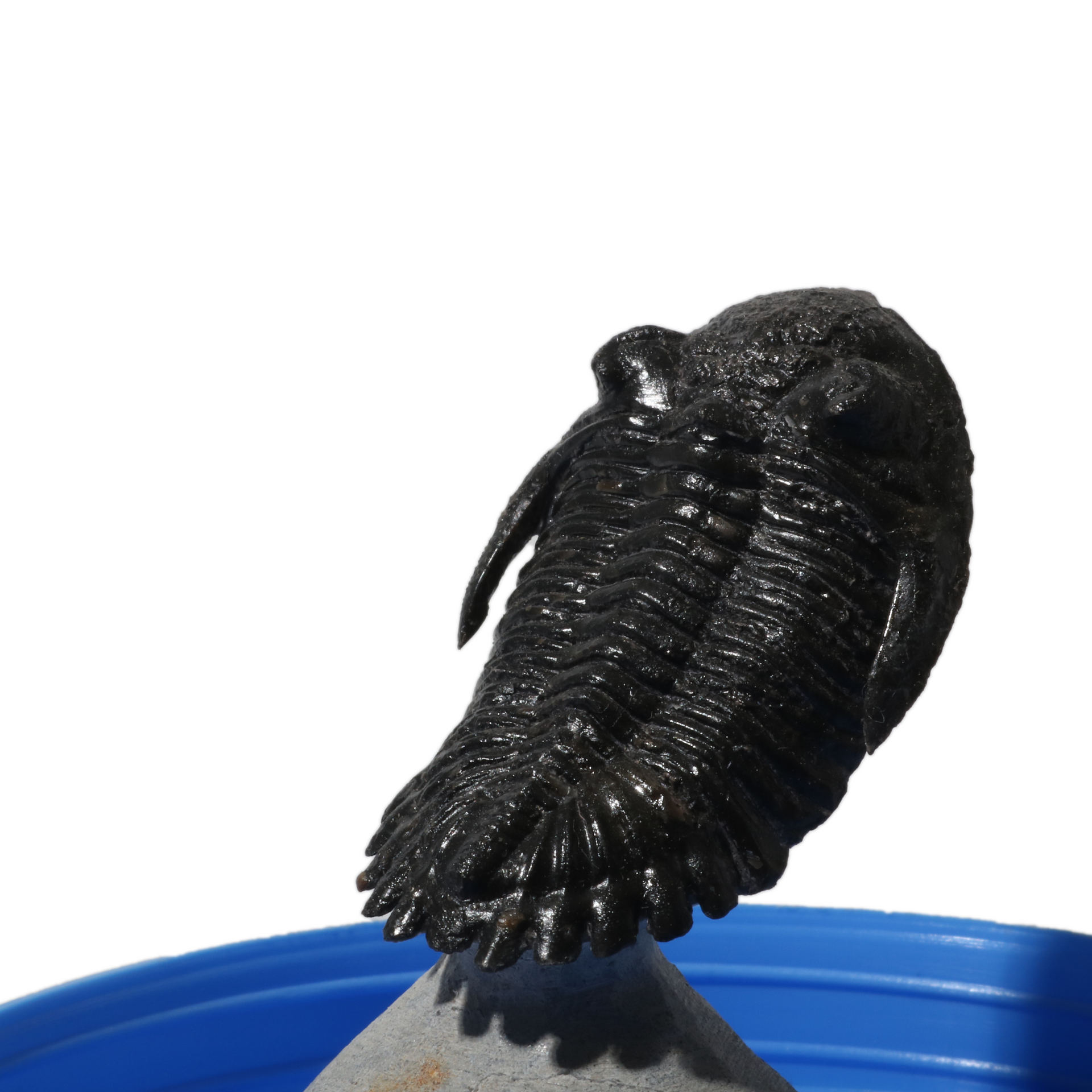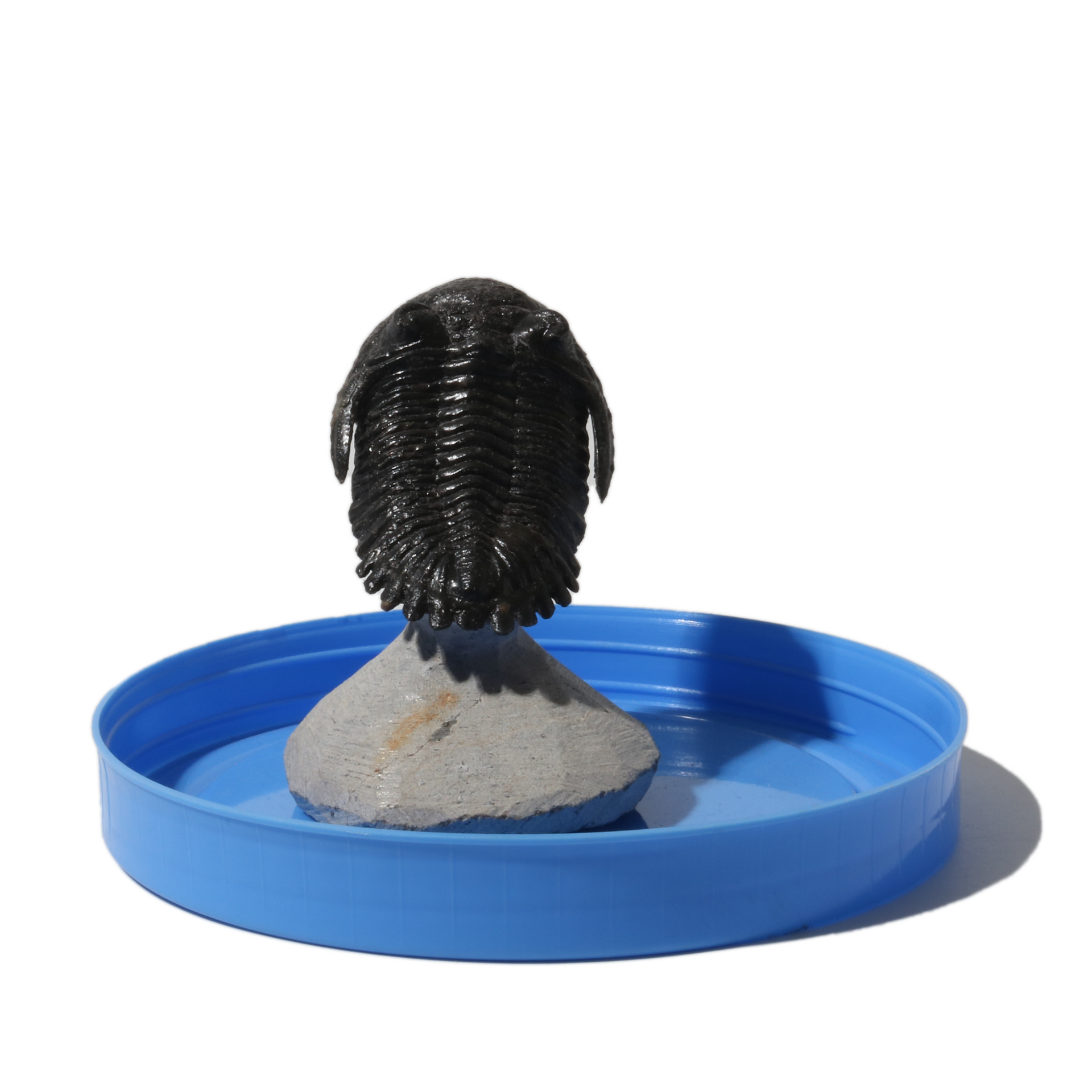 Trilobites are among the earliest known arthropods, and their fossils are highly prized for their detailed preservation and historical significance. This particular specimen is showcased in striking black, highlighting its intricate exoskeleton and natural symmetry.