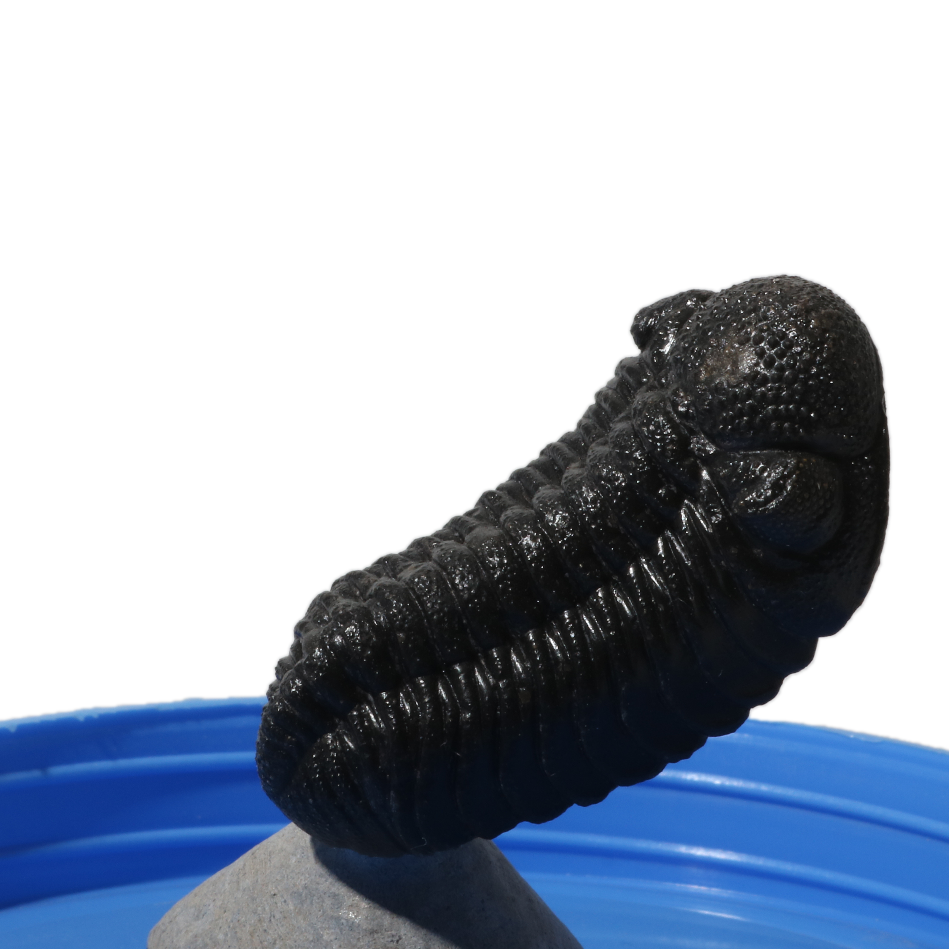 Trilobites are among the earliest known arthropods, and their fossils are highly prized for their detailed preservation and historical significance. This particular specimen is showcased in striking black, highlighting its intricate exoskeleton and natural symmetry.