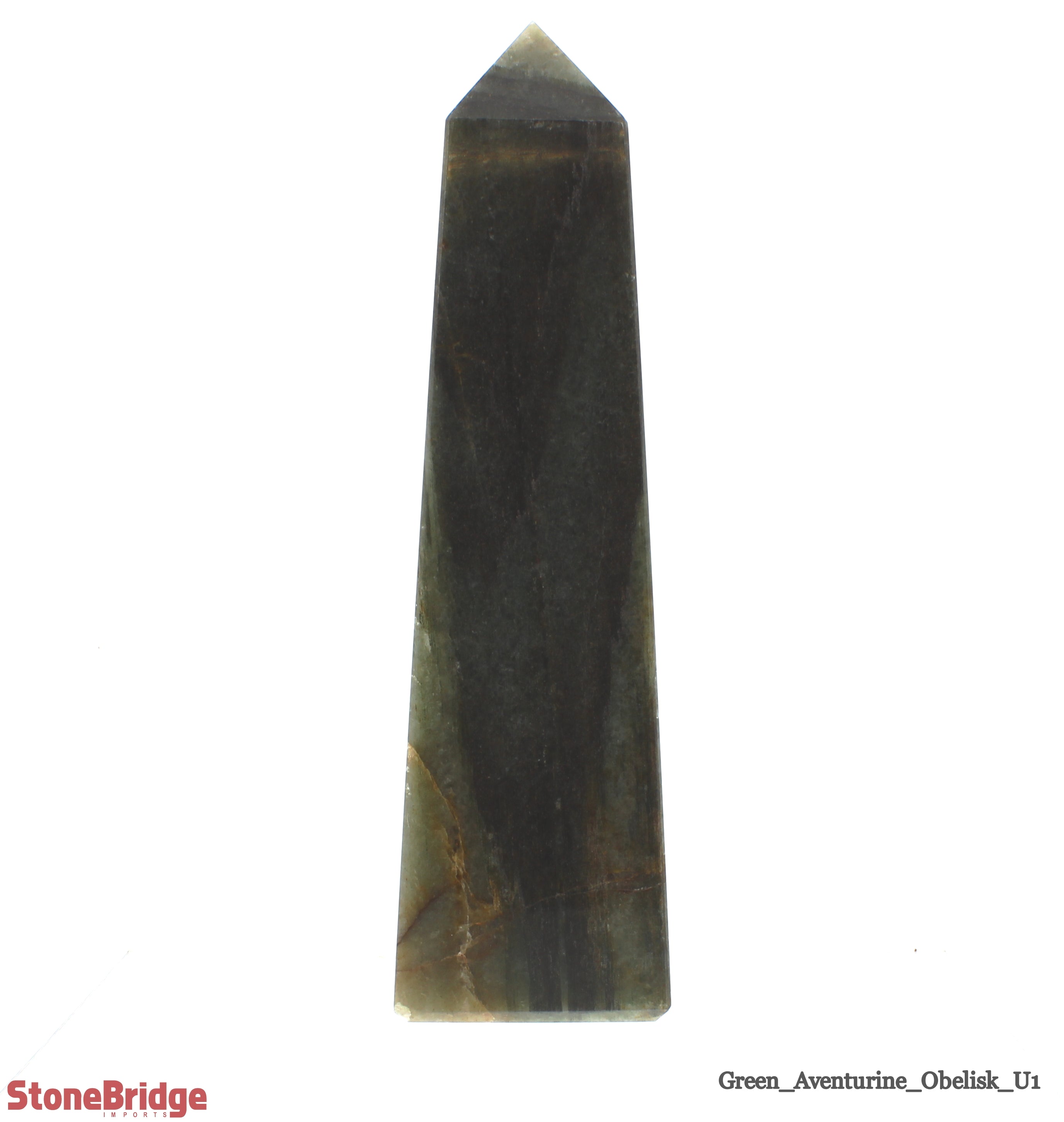 Green Aventurine Obelisk is a monolithic stone with a quadrangular beveled base. Standing upright and ending with a pointed tip, with natural colorings from a mossy green on one side of its face and a almost dark near black tone, while containing a natural orange-toned vein wrapping round its faces close to its base.