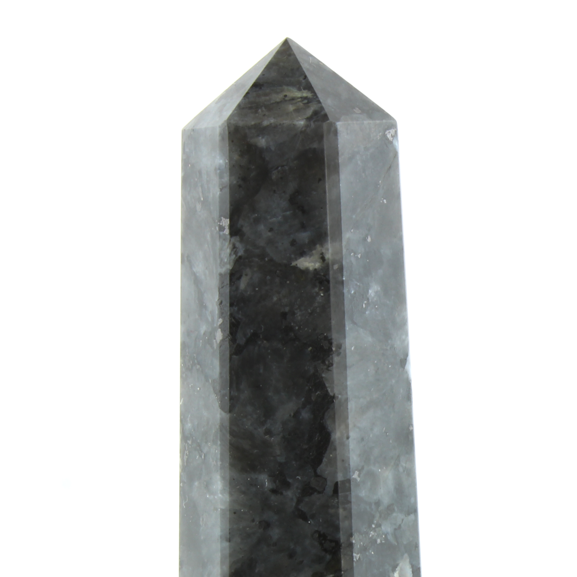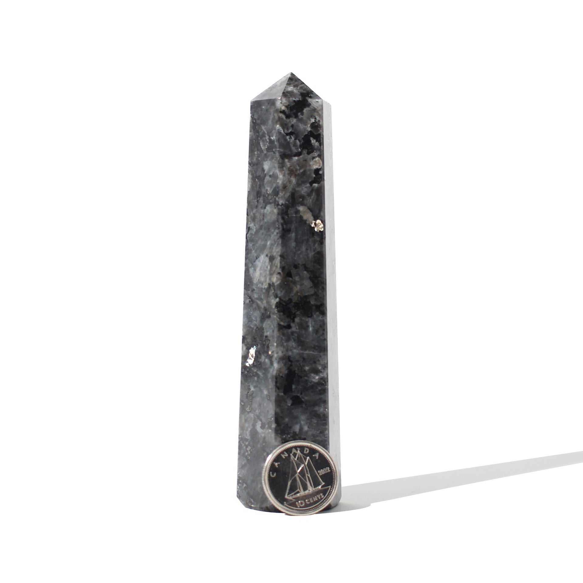 This Larvikite Generator features a stunning mix of dark greys and blacks with silvery flashes of labradorescence that shimmer under light.