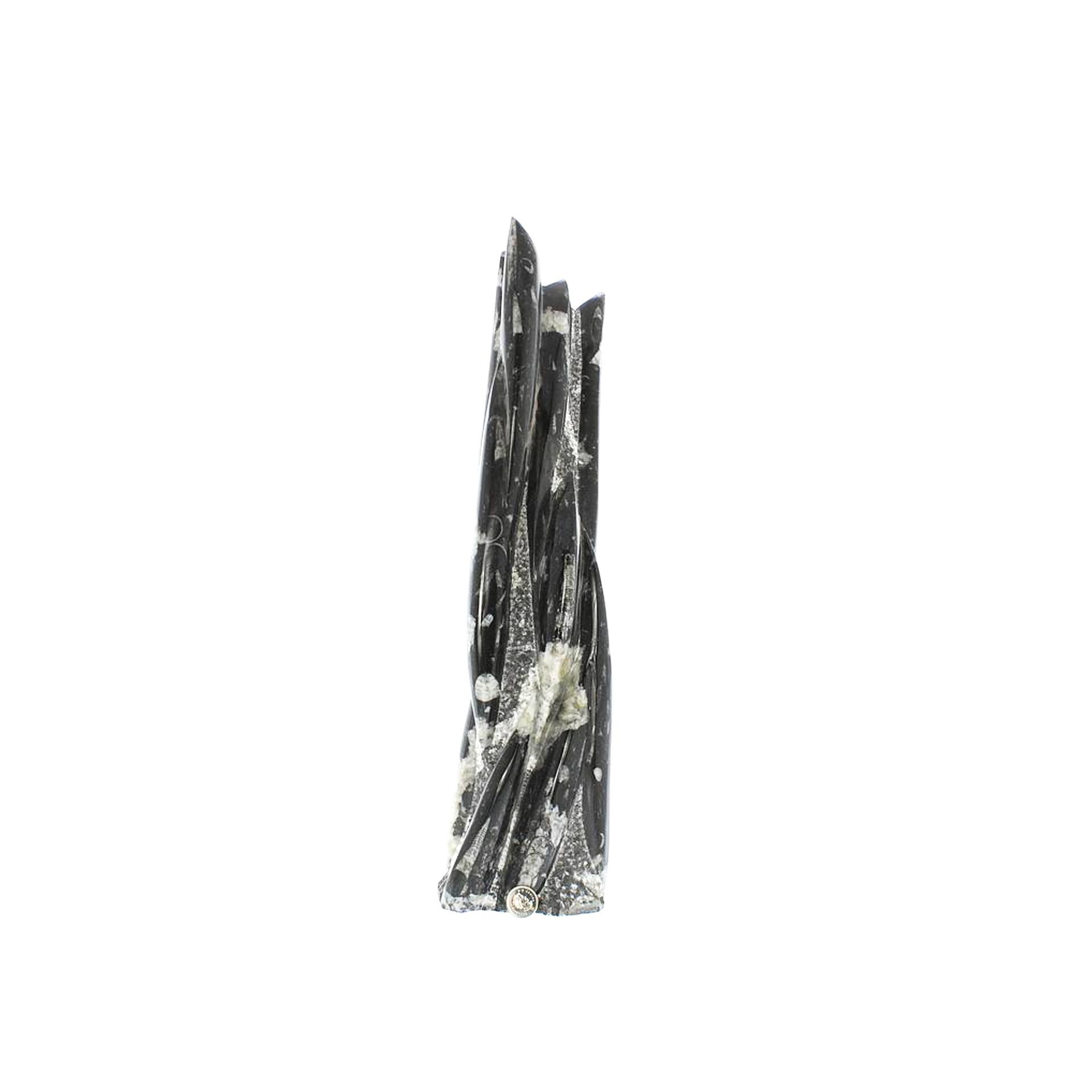 This is a 21” Inch tall tower coated in fossiliferous rock (the black marble-like matrix). These Orthocera sculptures are created by chiselling the stone to reveal the Orthocera fossil. The base is cut flat so that it can free-stand complementing any home or workplace display.