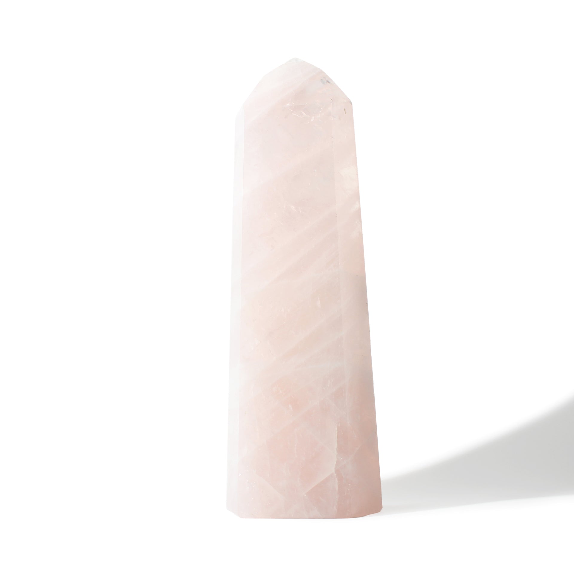 This Rose Quartz Generator stands 7" tall, showcasing soft blush-pink tones with gentle translucency, polished into a smooth, elegant point that radiates calming, heart-centered energy. Each piece highlights Rose Quartz's natural beauty and soothing presence.
