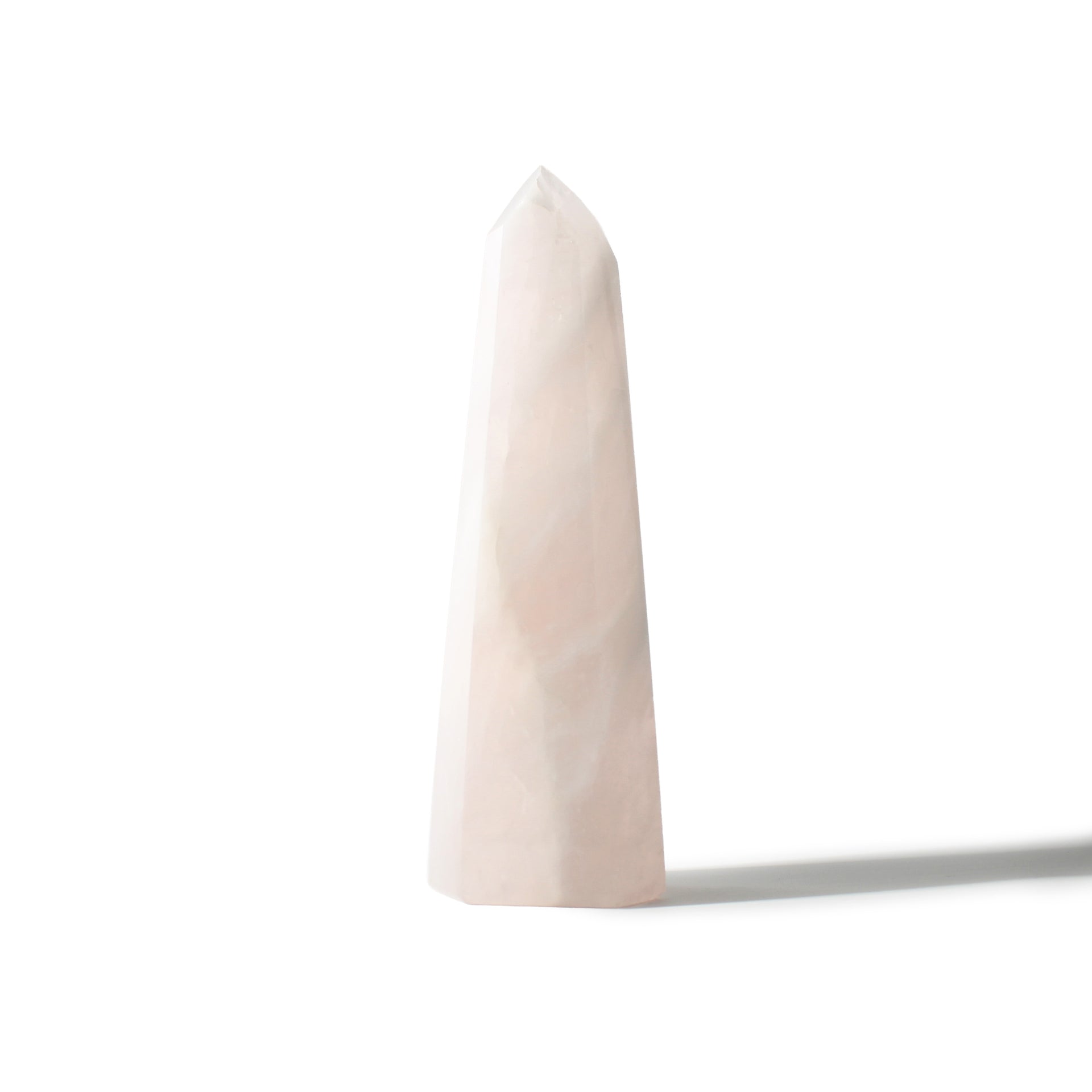 This Rose Quartz Generator stands 8" tall, showcasing soft blush-pink tones with gentle translucency, polished into a smooth, elegant point that radiates calming, heart-centered energy. Each piece highlights Rose Quartz's natural beauty and soothing presence.