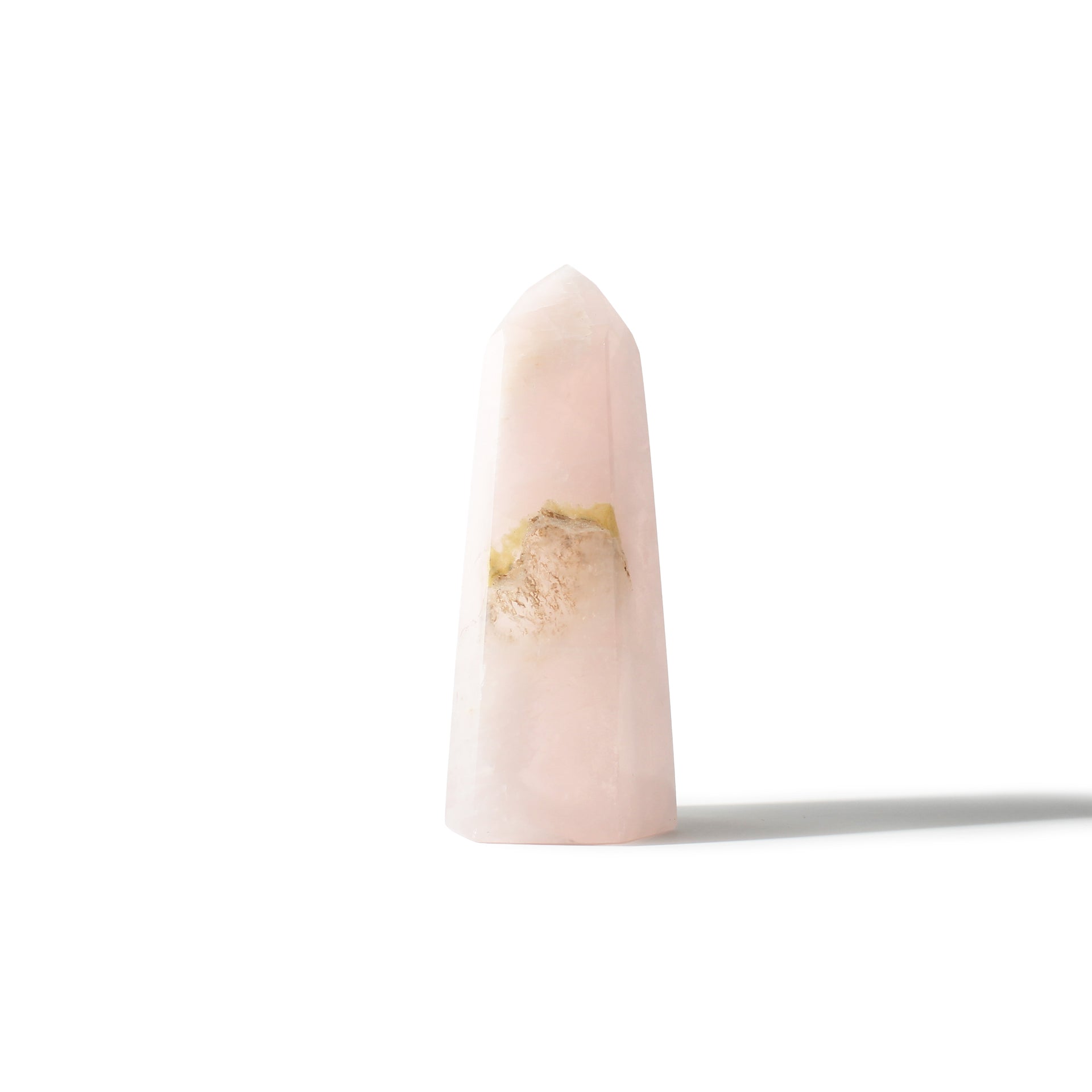 This Rose Quartz Generator stands 5 1/2" tall, showcasing soft blush-pink tones with gentle translucency, polished into a smooth, elegant point that radiates calming, heart-centered energy. Each piece highlights Rose Quartz's natural beauty and soothing presence.