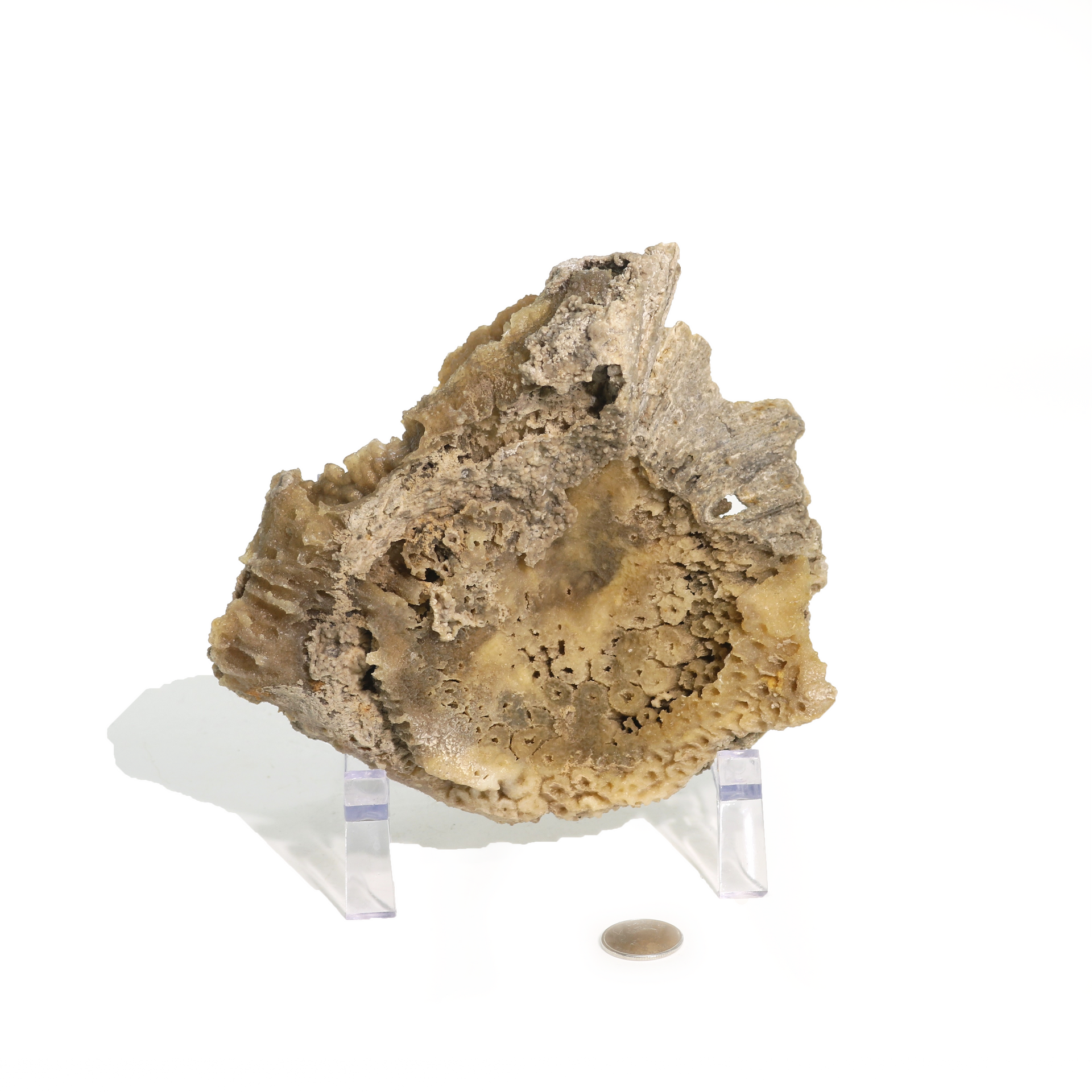 A rare and extraordinary find, an agatized coral fossil from the Miocene era at 52 to 214.2 million years old, this fossil is a true marvel of nature. Formed through a process of sediment covering shallow coral reefs and the subsequent replacement of the coral’s calcium carbonate skeleton with chalcedony through the infiltration of silica-rich groundwater, this specimen is a testament to the enduring power of the natural world.
