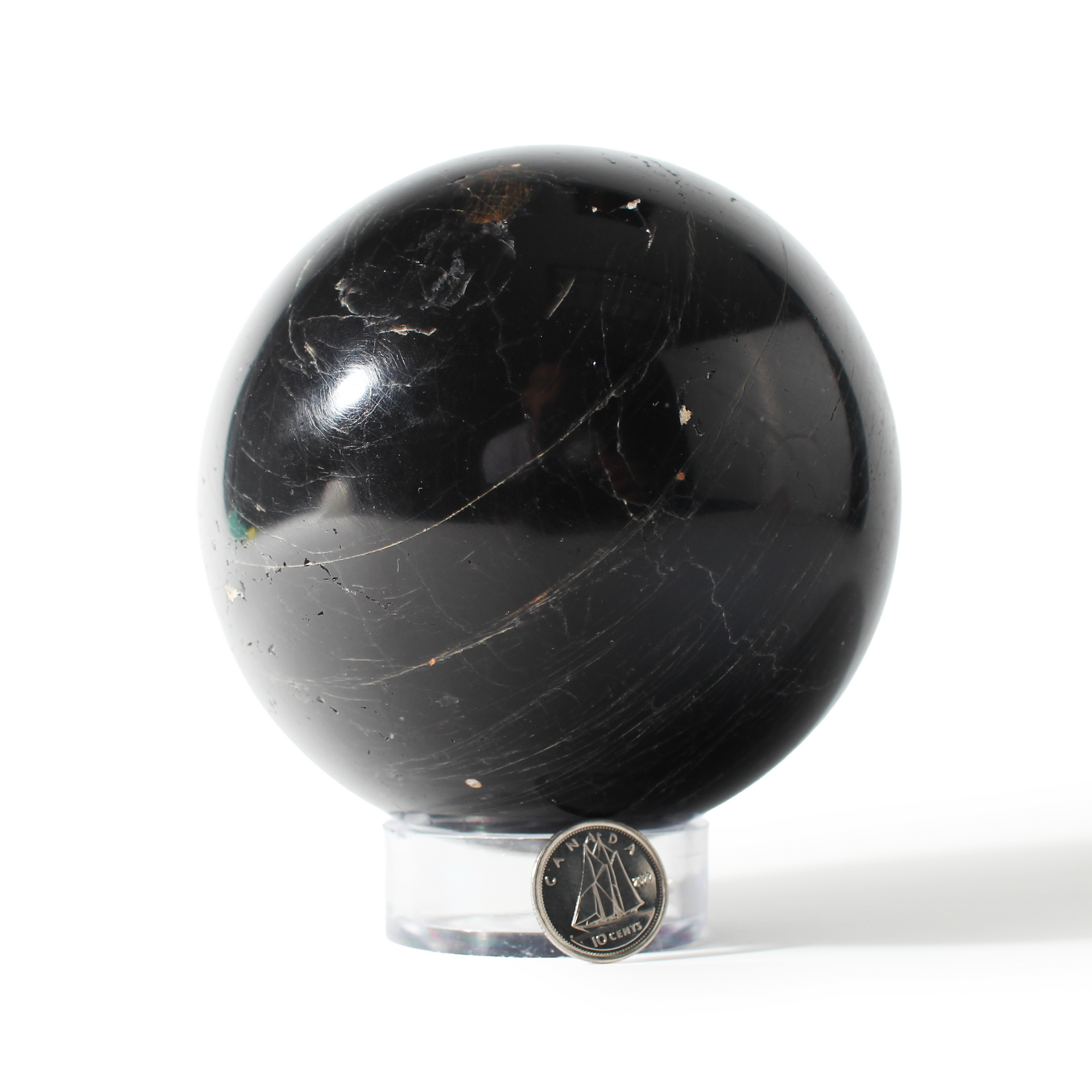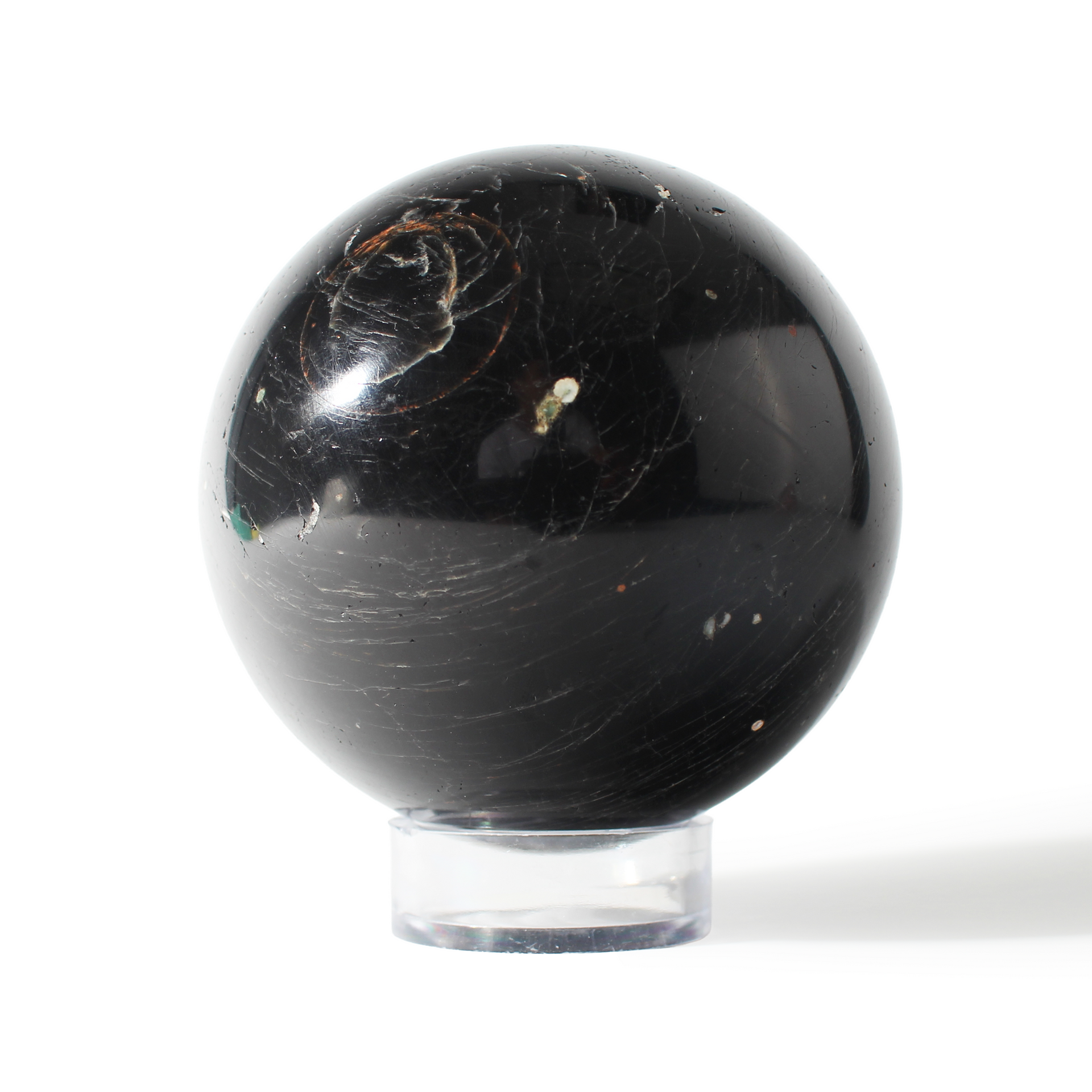 Tourmaline with Hematite Sphere Unique #10 measures 3 3/4" and features a striking mix of black tourmaline streaks and metallic hematite shimmer. Protective and grounding, it’s a powerful ally for energetic stability and focus.