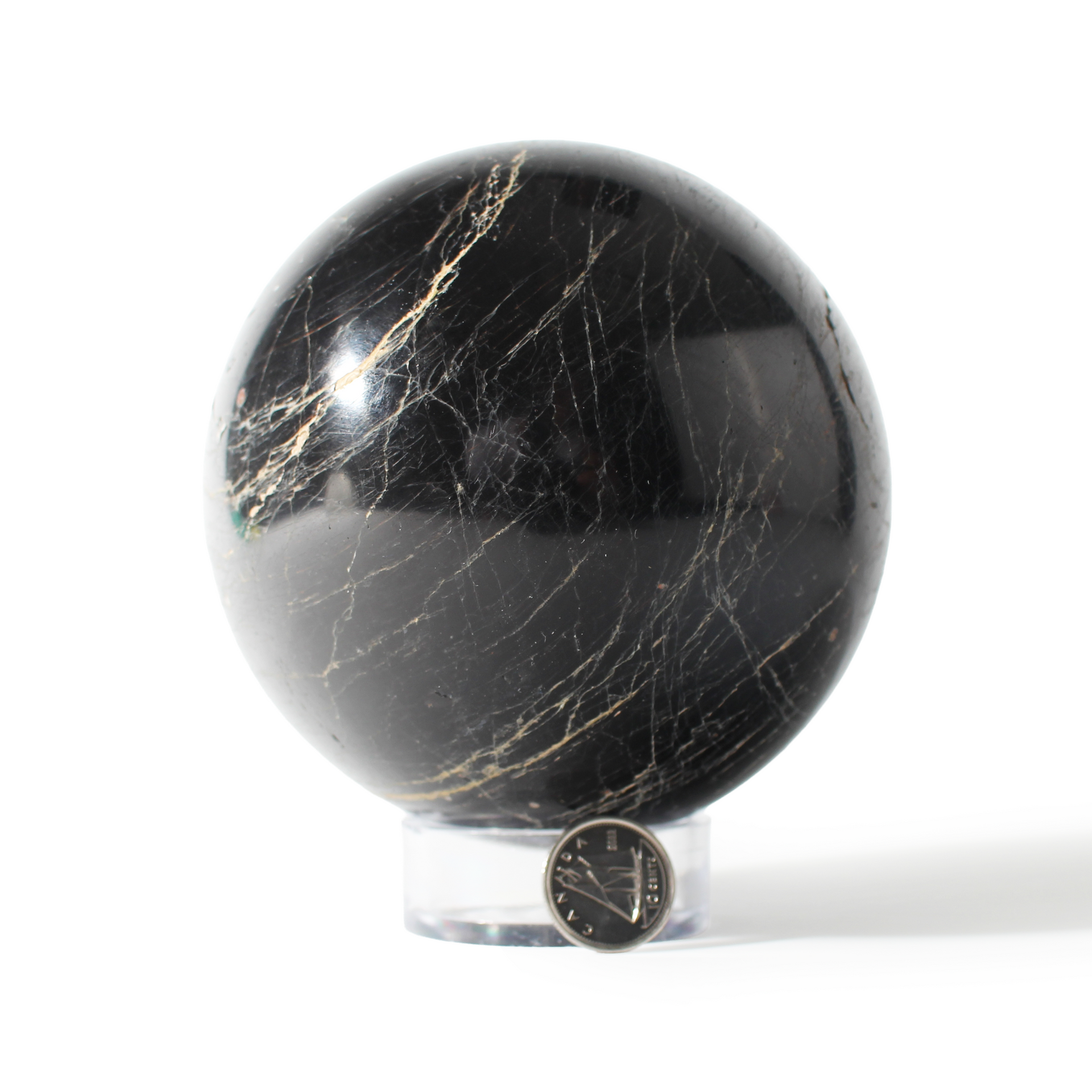 Tourmaline with Hematite Sphere Unique #13 measures 3 7/8" and features a striking mix of black tourmaline streaks and metallic hematite shimmer. Protective and grounding, it’s a powerful ally for energetic stability and focus.