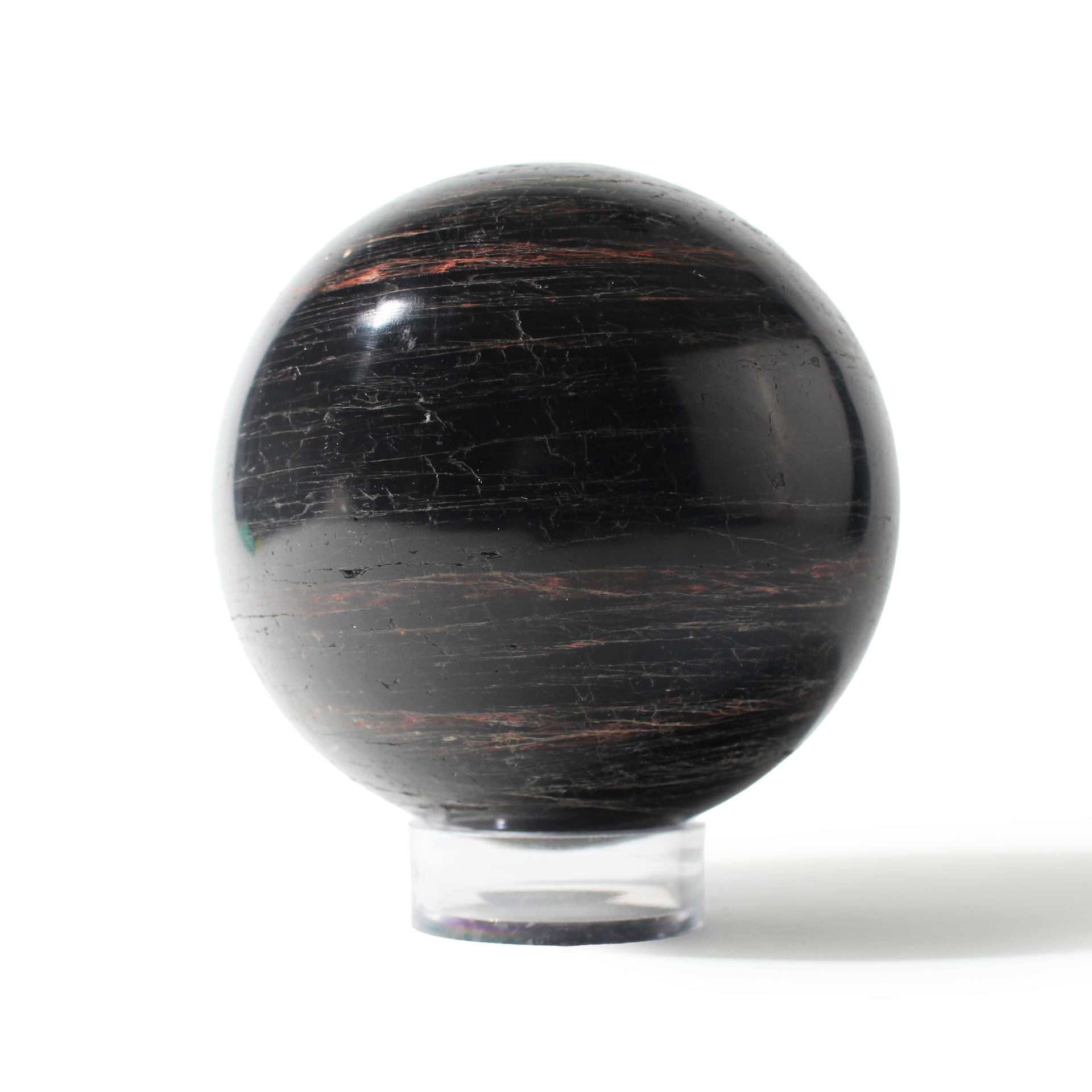 Tourmaline with Hematite Sphere Unique #6 measures 4" and features a striking mix of black tourmaline streaks and metallic hematite shimmer. Protective and grounding, it’s a powerful ally for energetic stability and focus.