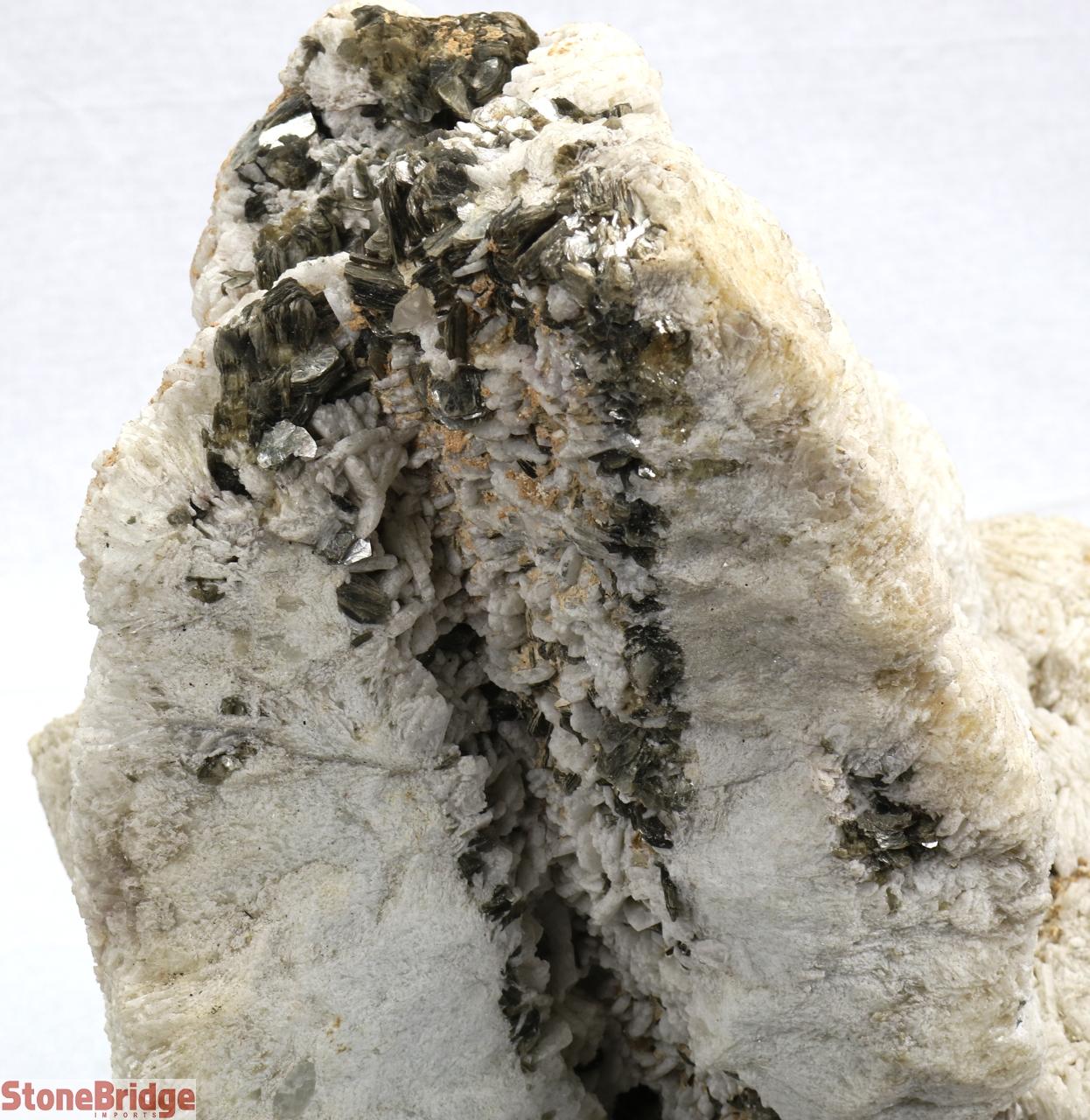Albite Stone Specimen - Unique #7 Albite is a special type of feldspar, and when it forms in dense clusters of blades, it is known as Cleavelandite. The specimen for sale is a vertically-oriented piece that is shaped like a beehive. There is one side that shows an exposed central column, which gives it a geode-like appearance. Most of the mica on this piece is located in the column and tip of the “towers”. This is a very interesting and amazing specimen for display and appreciation. Note: This product is fairly brittle and must be handled with care.
