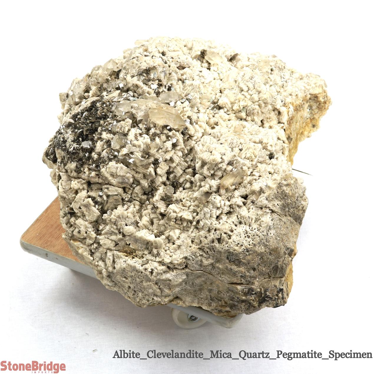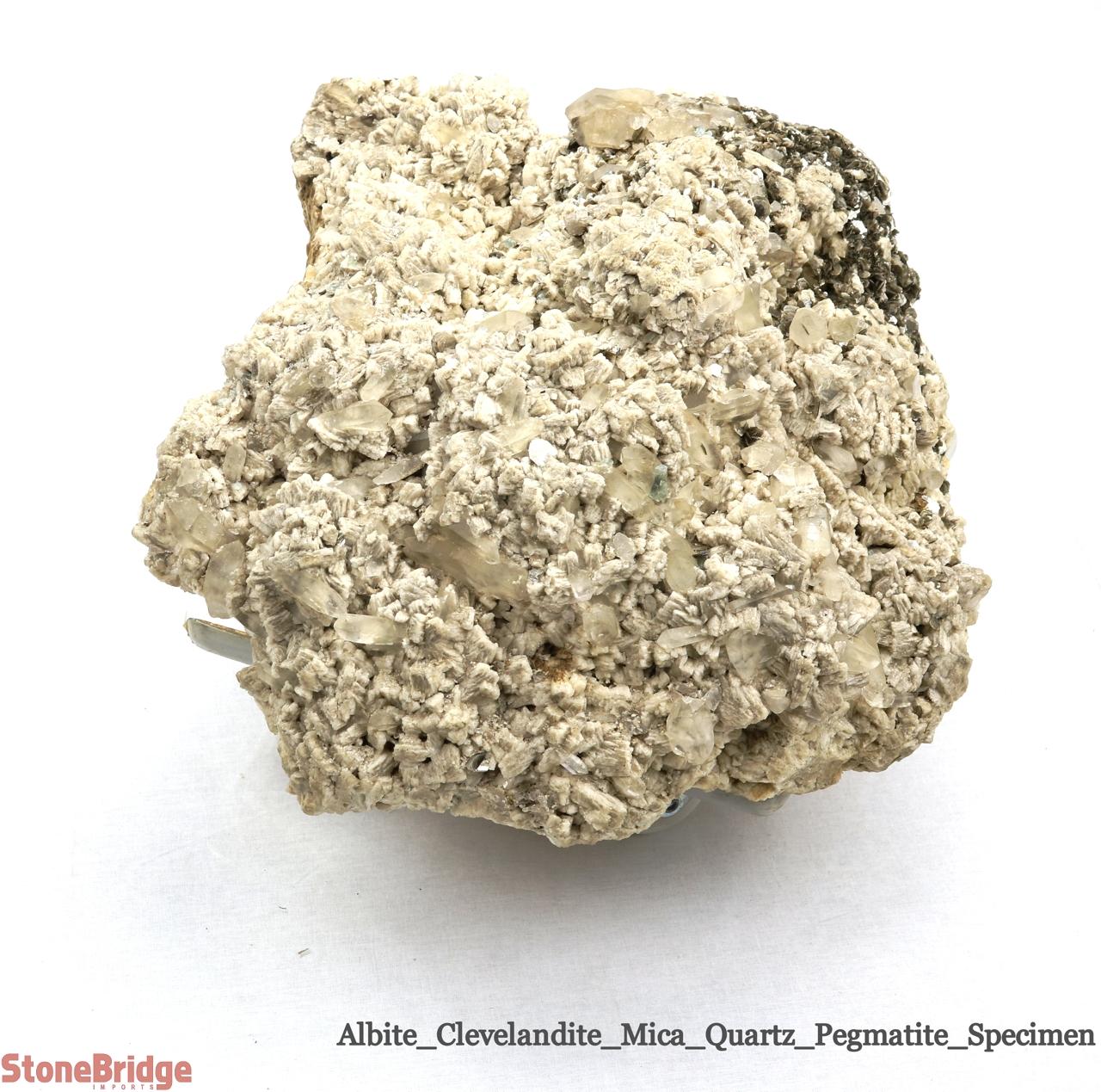 Albite Stone Specimen - Unique #6 Albite is a versatile rock that grows a variety of crystals and minerals. From a distance, this piece appears as only albite, but up close, there are many quartz crystal formations to be found. The piece also has clumps of tiny mica blades, feathery albite formations, and is arched in shape. In addition, there are several small aquamarine crystals among the albites. The specimen is an excellent representation of the variety that albite and pegmatite can host. Note: This product is fairly brittle and must be handled with care.
