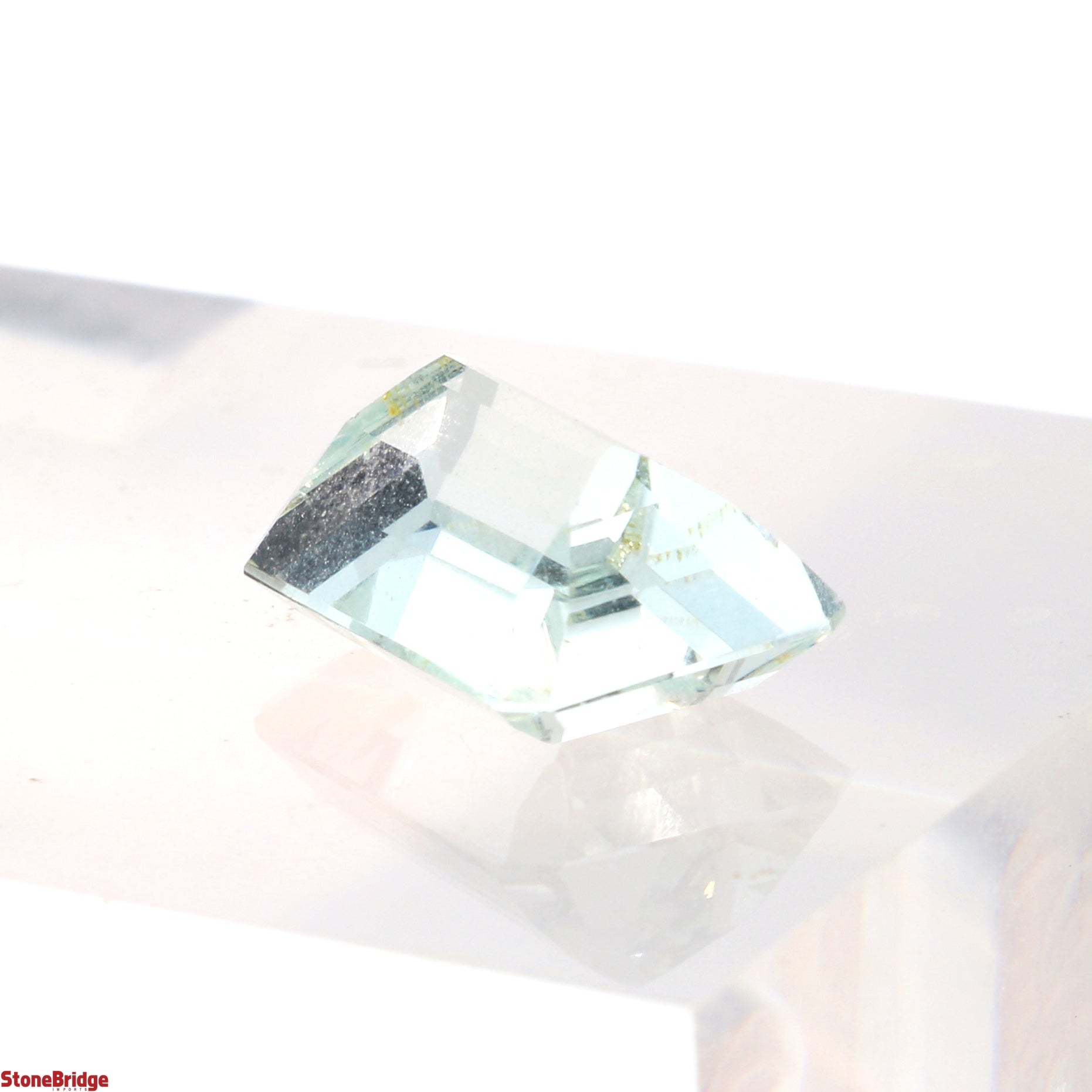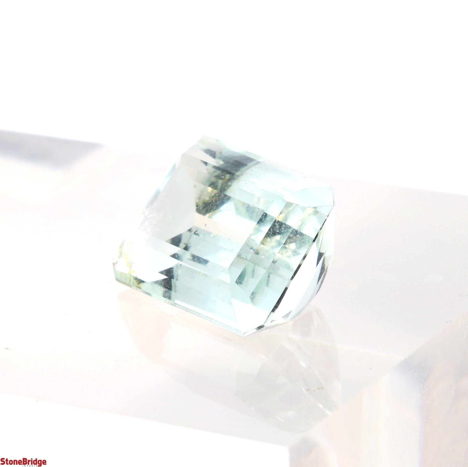A single piece of aquamarine faceted and polished (Emerald-cut) defines the gem with a characteristic rectangular shape with tapered/bevelled corners. The gem is of the blue variety; its colour is a light pastel greenish-blue or pale blue similar to clear and transparent seawater.