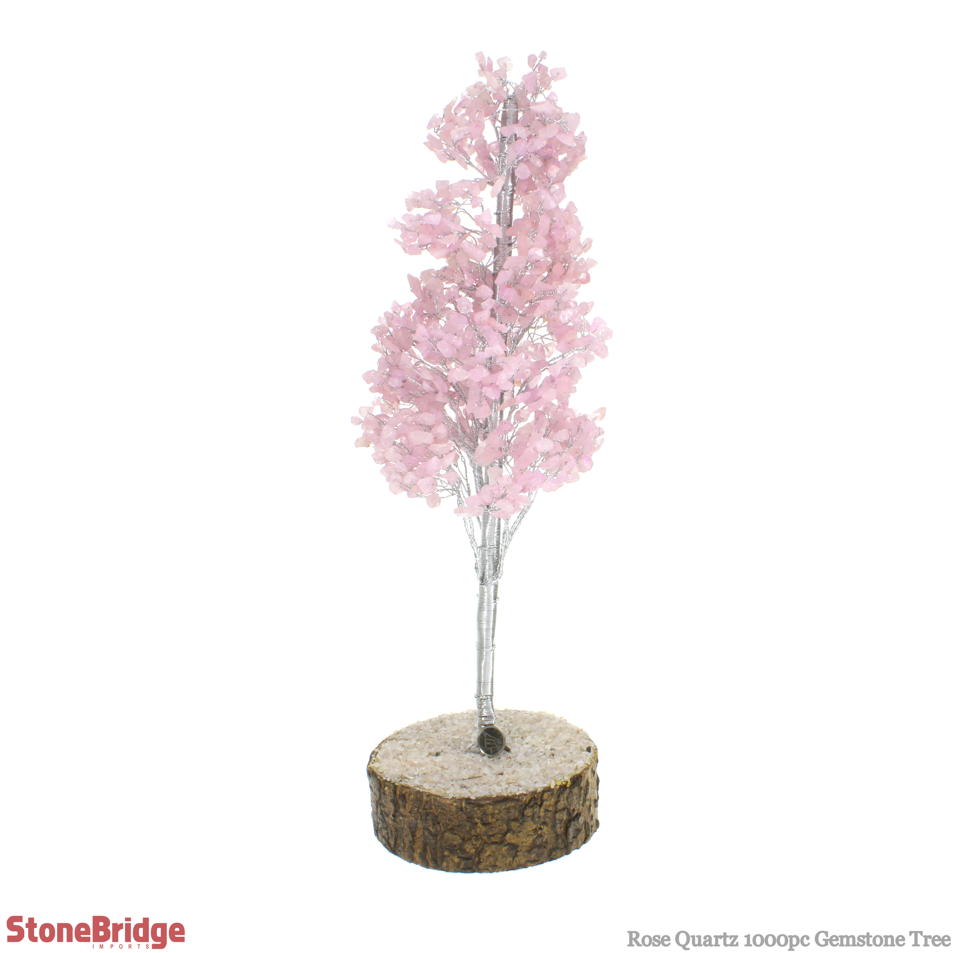 A gemstone tree sits on a thick slice of wood (Approx. 2” x 4 ½“) with pieces of rough quartz glued on. The tree trunk and branches are made out of metal wire wrapping. The tree contains several intricate branches with small pieces (approx. 1000 pieces) of rose quartz. These branches can be shaped and moved to make the tree look different. When nature and love are combined, you get these wonderful gemstone trees.