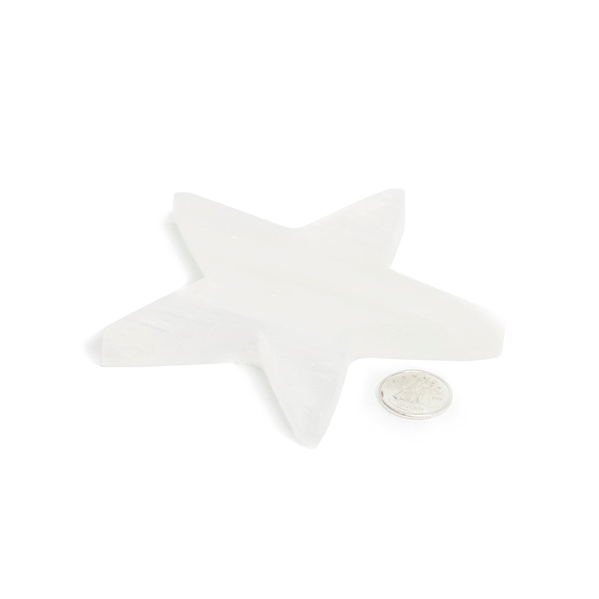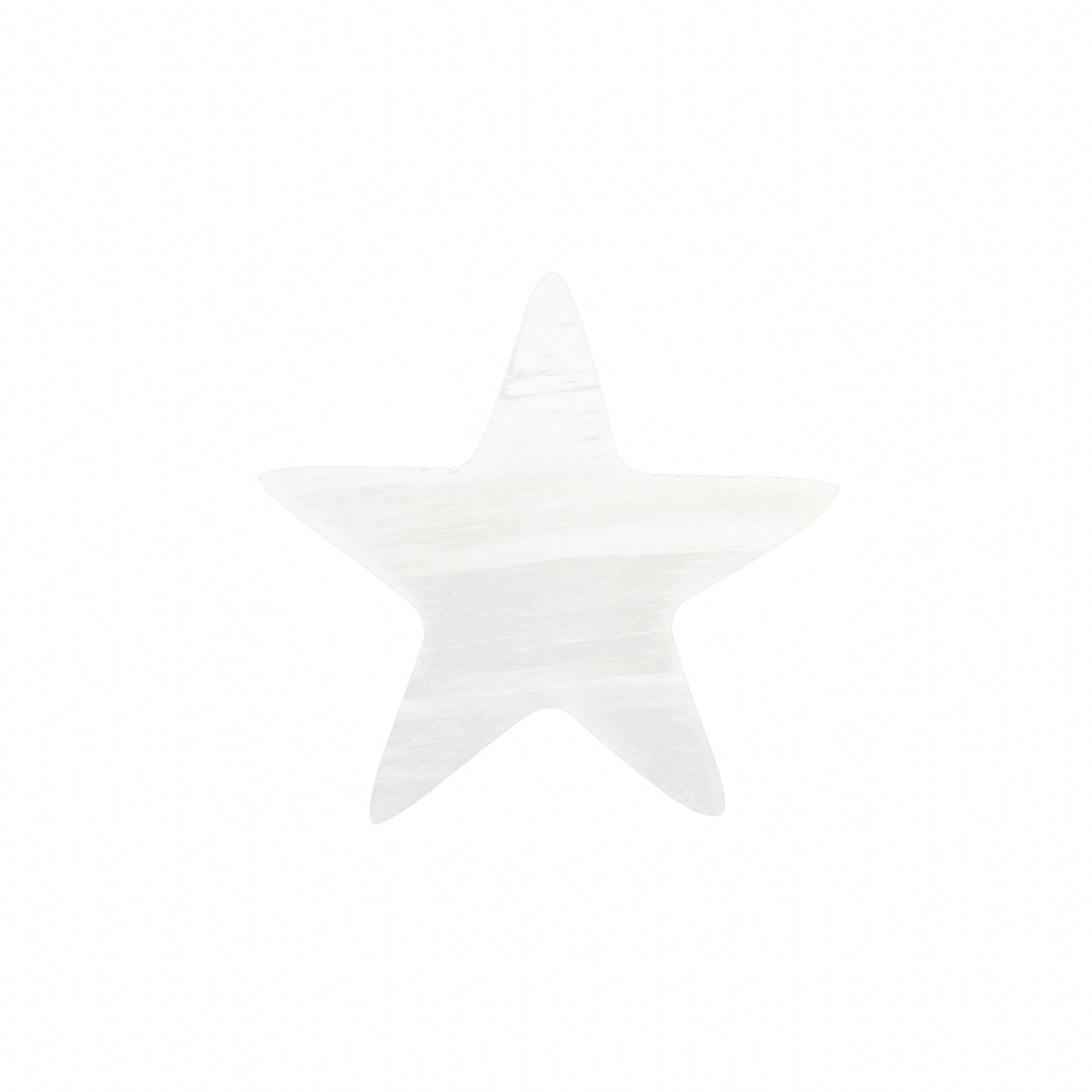 Hand-carved Selenite star with a translucent sheen to pearly-white milky tones.