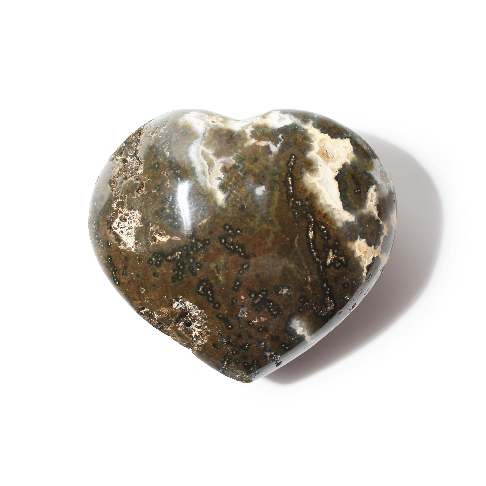 This Ocean Jasper Heart showcases swirling patterns and orb-like inclusions in earthy tones of green, cream, pink, and brown. Polished to a smooth finish, it carries nurturing, joyful energy with a deep connection to nature and flow.