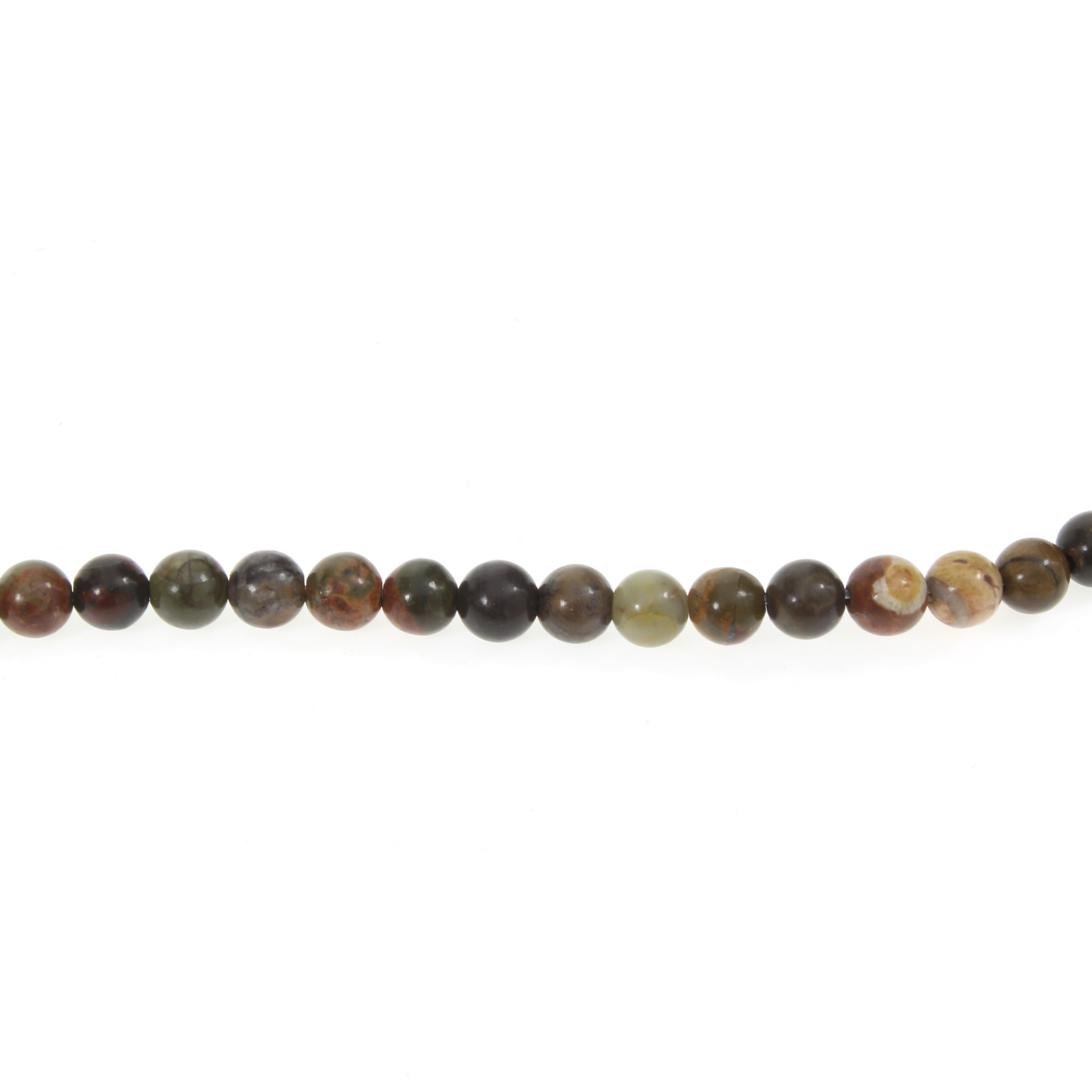This Picasso Jasper Round Strand features earthy greys, blacks, creams, and subtle browns, polished into smooth 4mm round beads along a 15-inch strand. Each bead showcases unique natural patterns, resembling abstract brushstrokes.