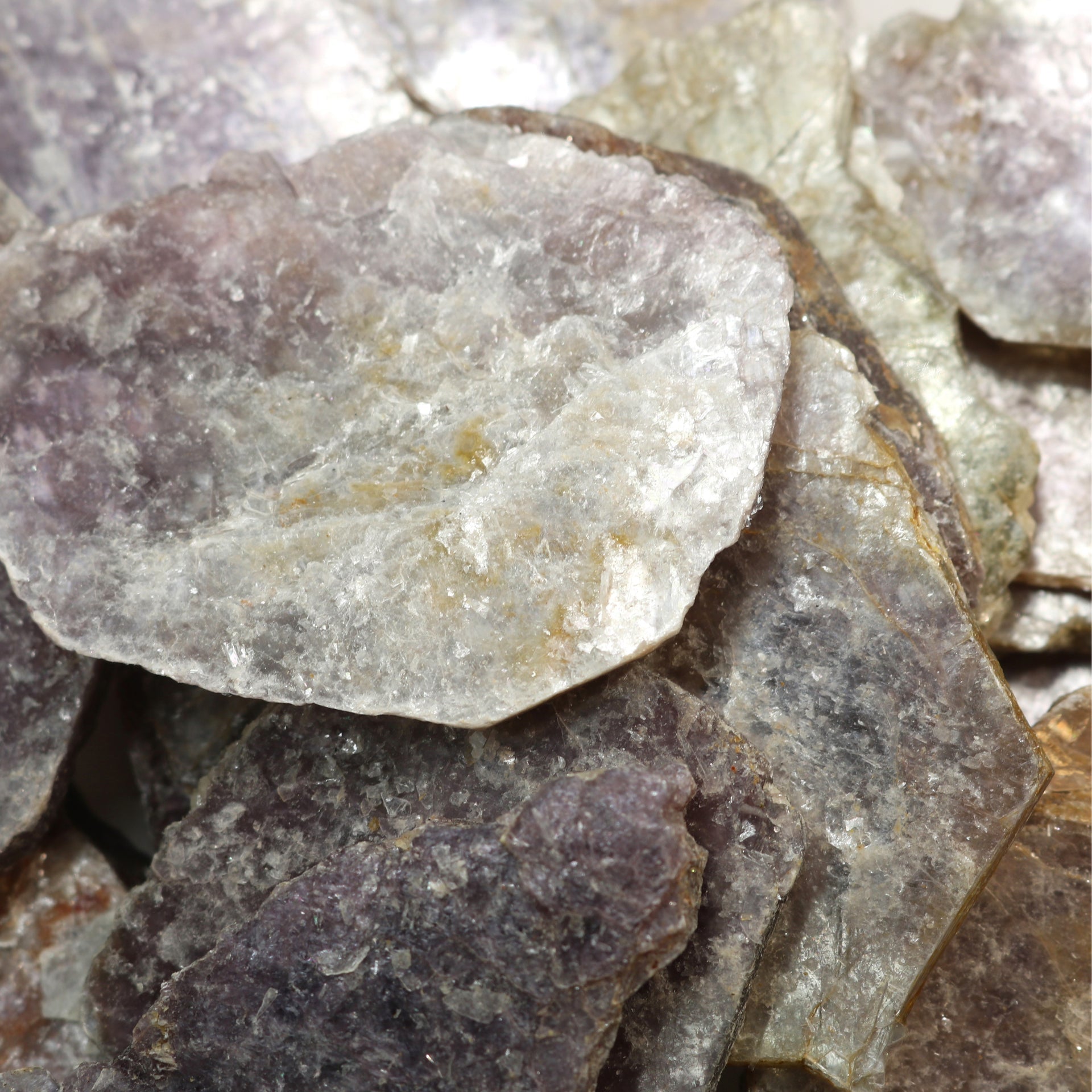 Lepidolite is a lithium-rich mica mineral that ranges in colour from shades of pink and purple to white.