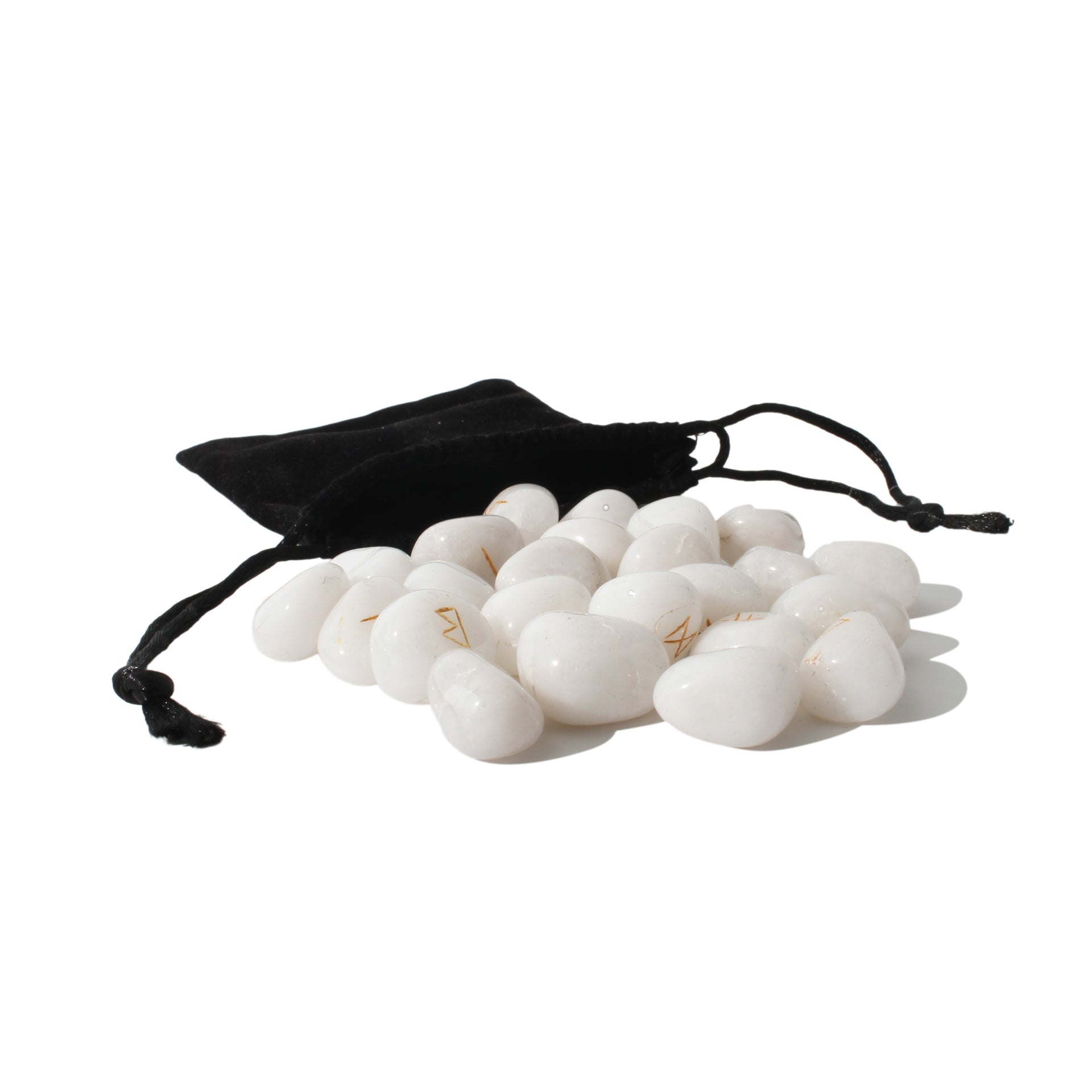 This White Agate Runes Set includes 24 engraved runes plus one blank, each hand-carved and gilded with golden symbols on soothing white agate for clarity and calm during divination.