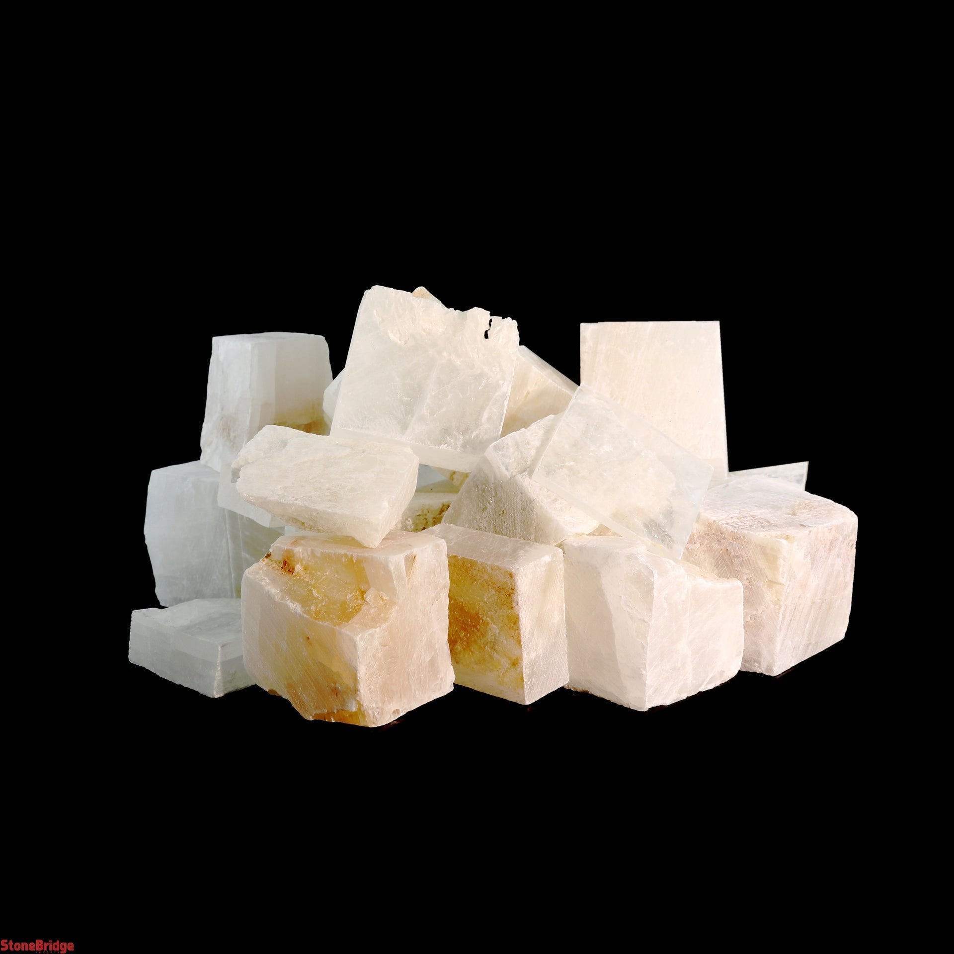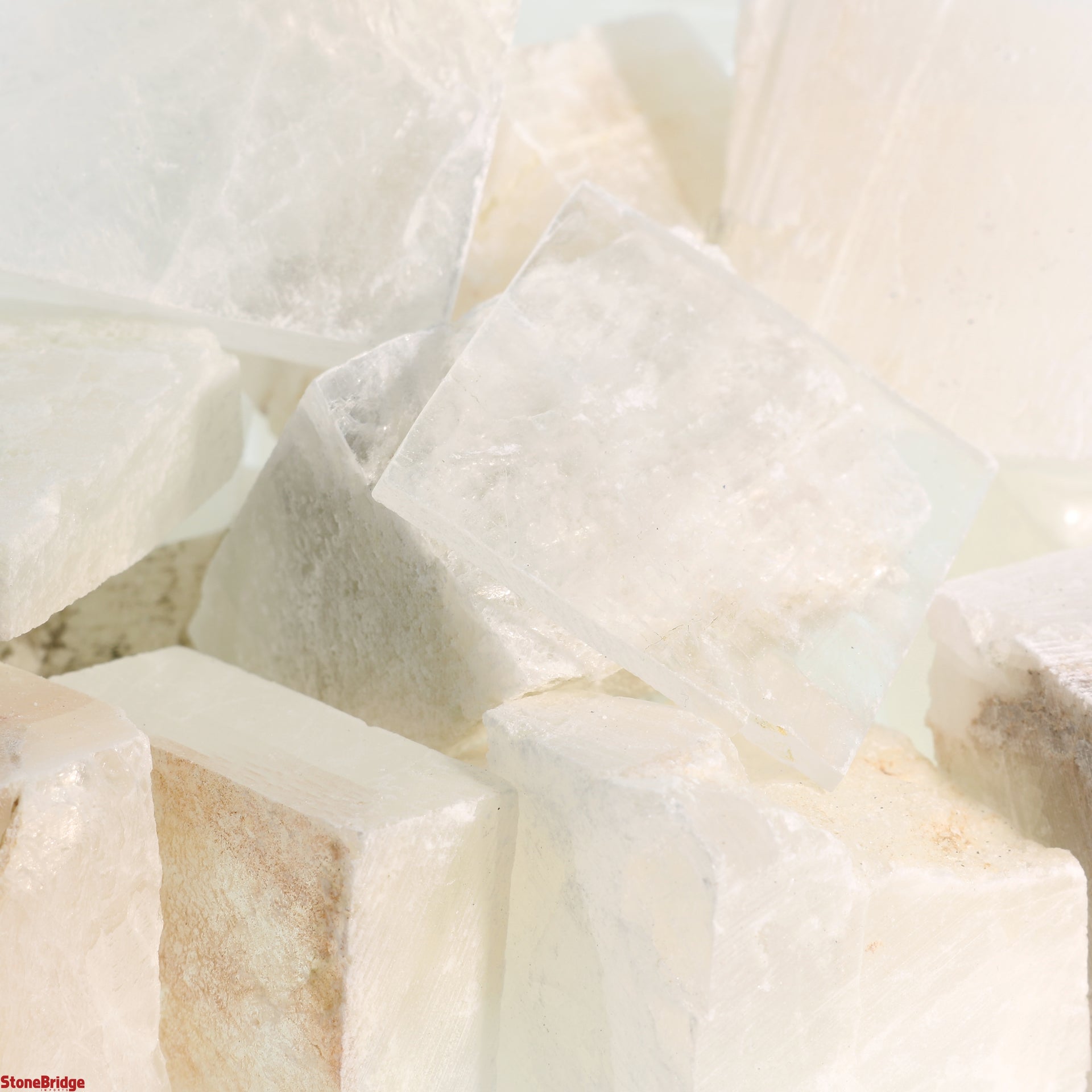 Natural Semi-translucent Selenite chips in a tabular, plate, Equant, Columnar, and Blade shaped with a series of ridges and markings running along with its faces.