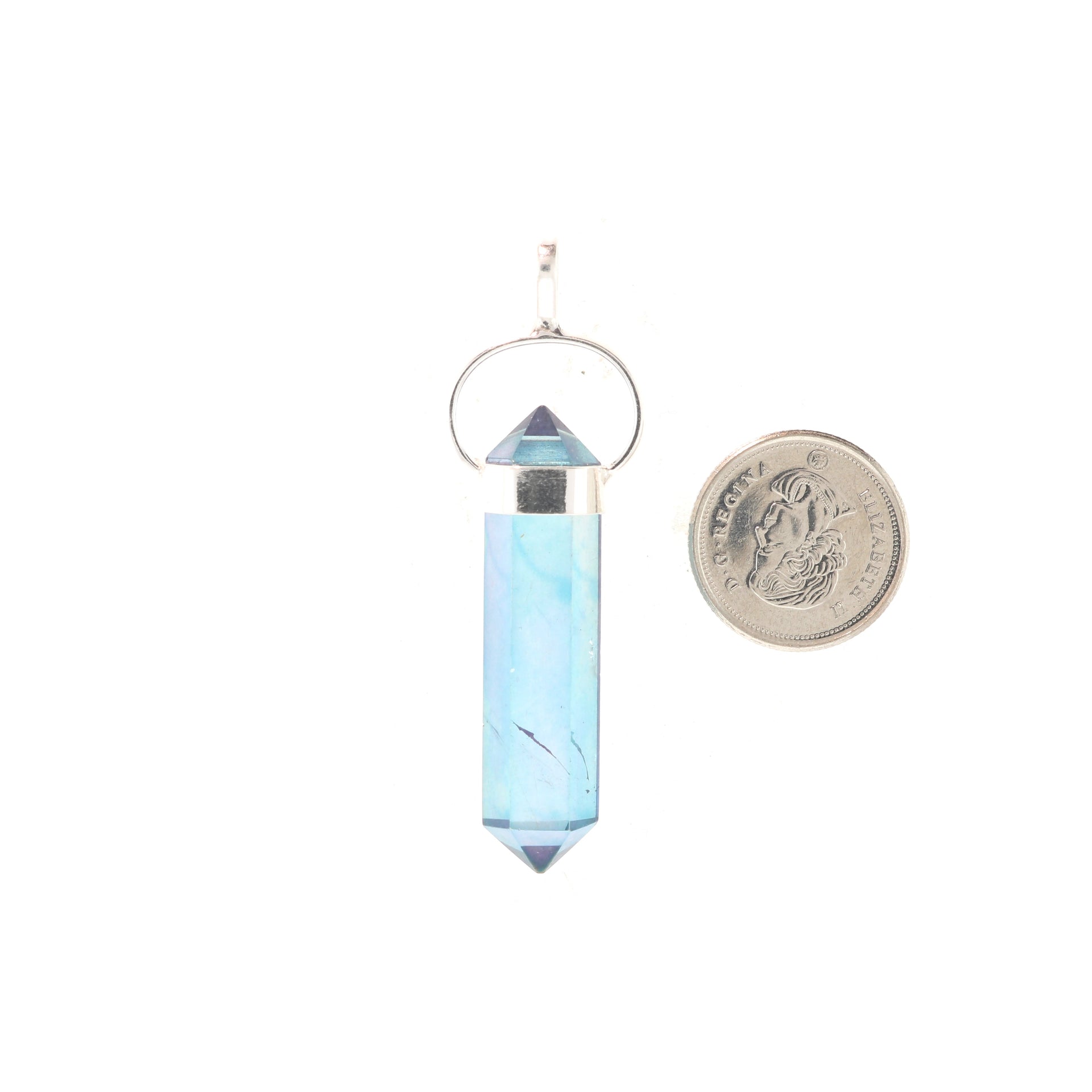 This Aqua Aura Double Terminated Pendant features a brilliant blue crystal point with a metallic iridescent sheen, created by bonding clear quartz with gold. Its sleek, faceted shape promotes energetic flow and high-vibe clarity.