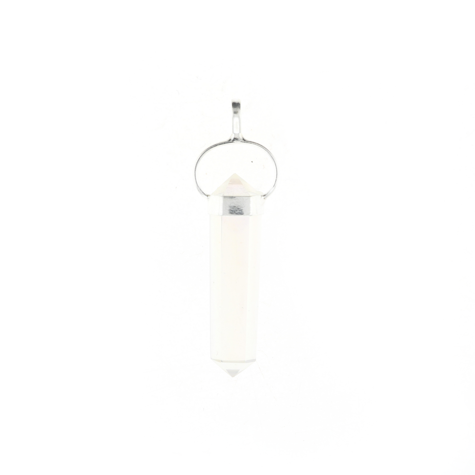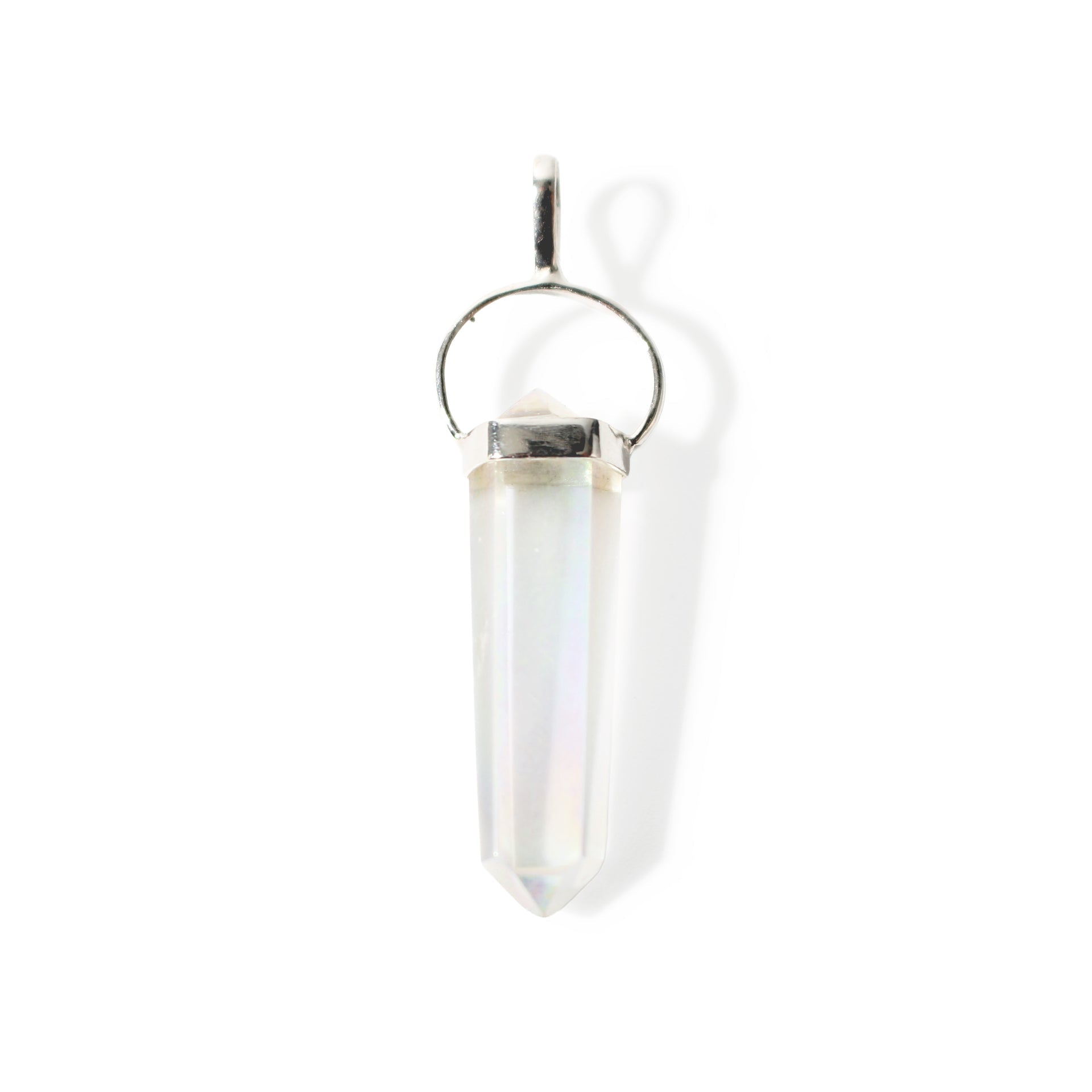 This Opal Aura Double Terminated Pendant shimmers with pearly iridescence and soft pastel flashes, created by bonding Quartz with platinum and silver. Its polished, faceted form radiates light and balanced energy flow.