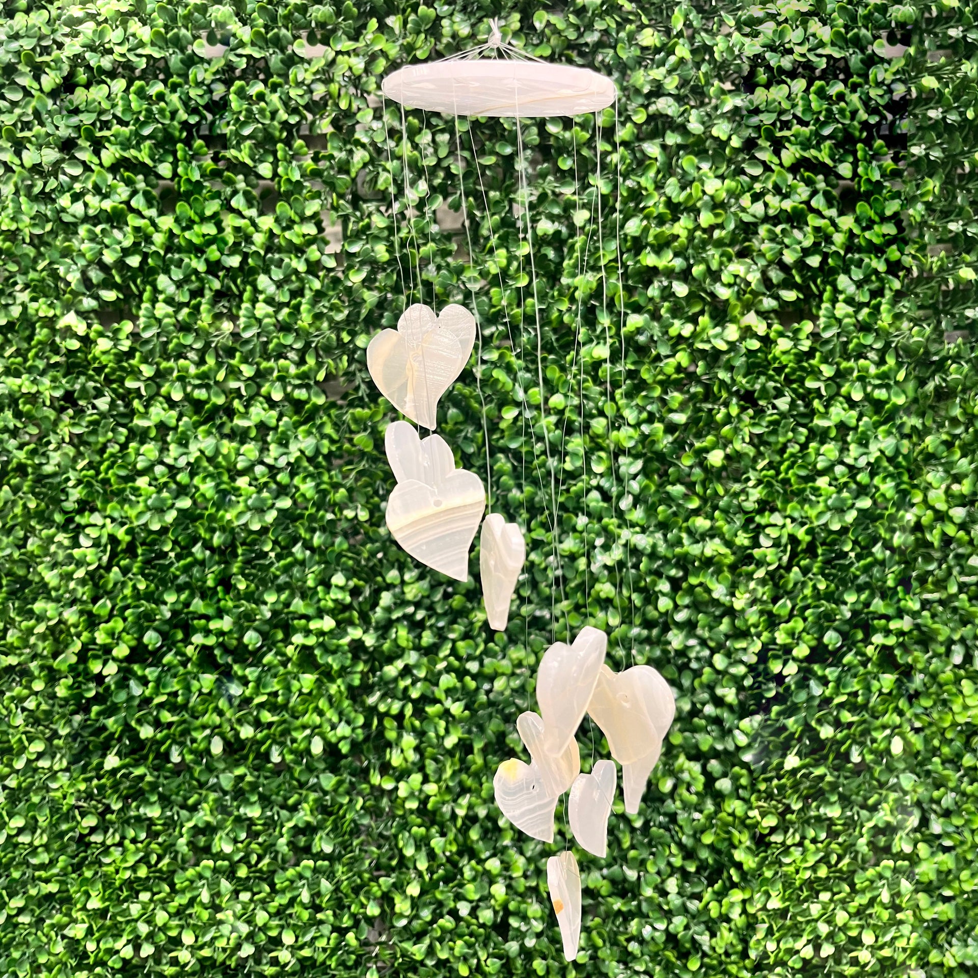Crafted from the serene white onyx, known for its soothing properties and clean aesthetic, each heart in this wind chime is a symbol of love and calm. As the breeze plays through these delicate hearts, it creates a gentle, melodious sound that enhances the tranquility of any environment.