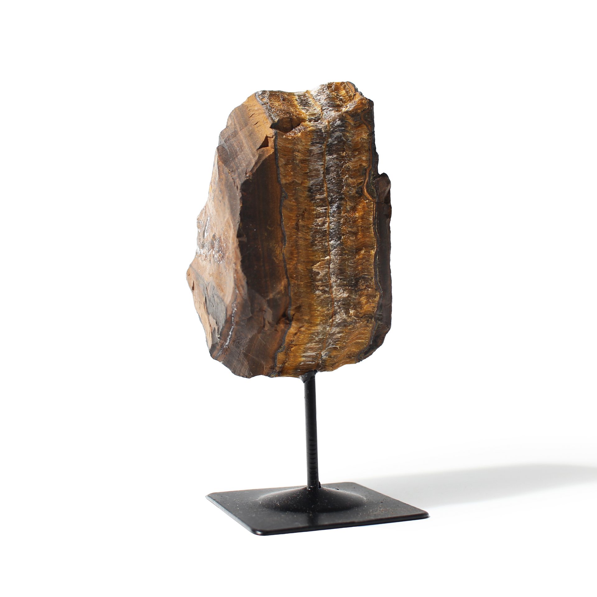 This Tiger Eye on Metal Stand ranges from 3 3/4" to 6 1/4" and features a polished slab of golden-brown Tiger Eye with signature chatoyant bands, elevated on a sleek black stand for display and energy work.
