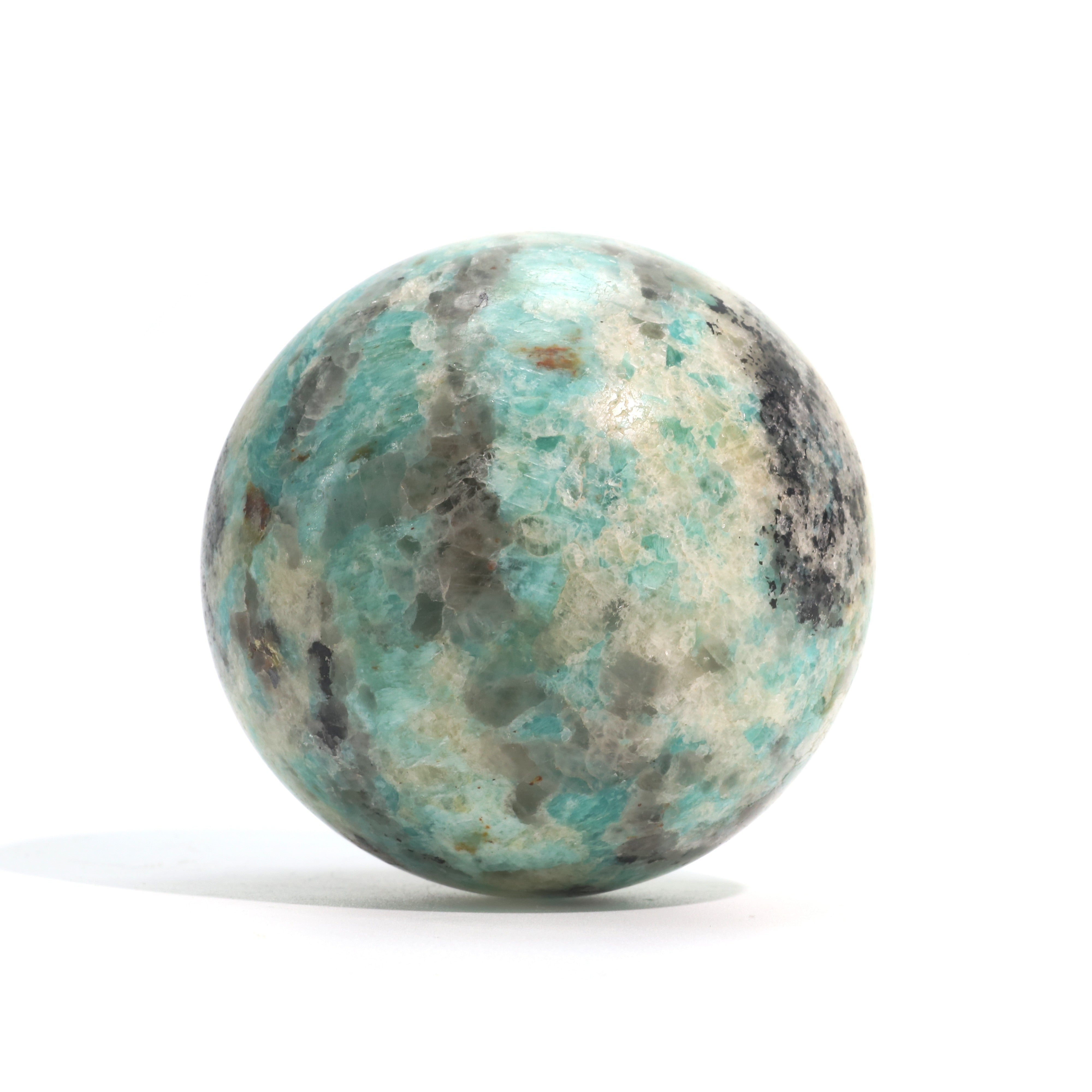 When you feel complete, spheres are the perfect answer. These beautiful Amazonite spheres gleam with high-quality craftsmanship that makes every piece truly one of a kind. Made from natural Amazonite, these spheres have a smooth finish that is both durable and attractive. Amazonite is also known as the Amazon stone. The Amazon River and the beautiful tropical landscape that surrounds it (upon its discovery) inspired the name. Patterned with soft green-blue cloudiness reminiscent of a rainforest setting, containing light to heavy splashes of Feldspar.