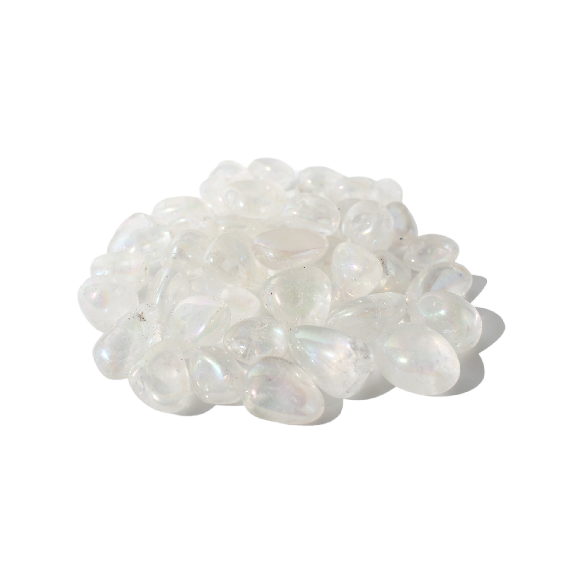 These Rainbow Aura Clear Quartz Tumbled Stones shimmer with iridescent color, pinks, blues, and golds dancing across a clear base. Each stone is polished to a high-gloss finish, with a luminous, otherworldly energy.