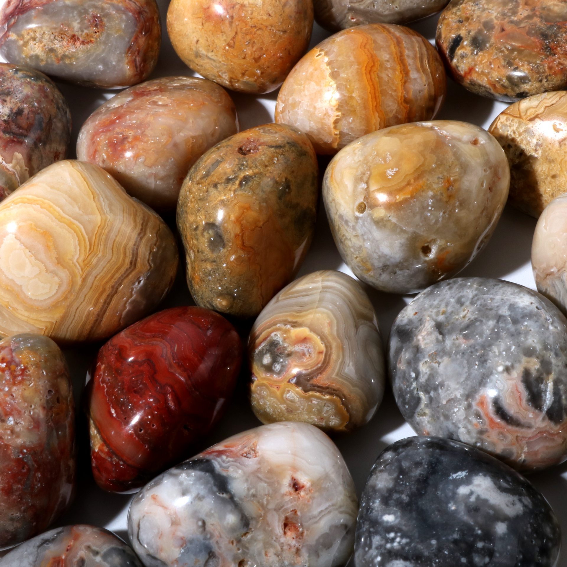 Known as the "Laughter Stone," Crazy Lace Agate is cherished for its intricate lacing of vibrant colors and patterns that evoke a sense of joy and optimism. Each stone is meticulously tumbled to a smooth, glossy finish that highlights the unique, banded designs characteristic of this variety.