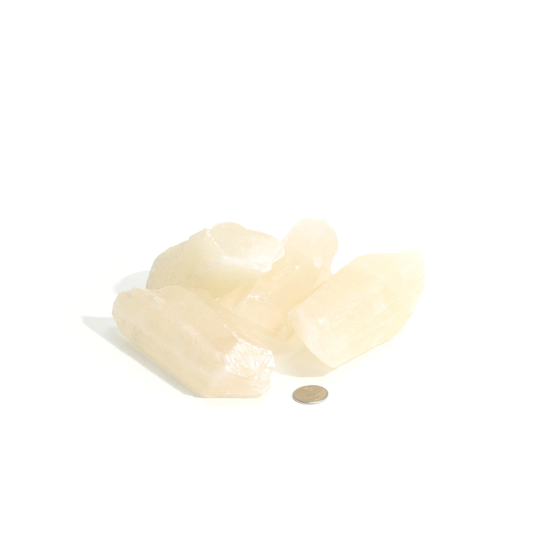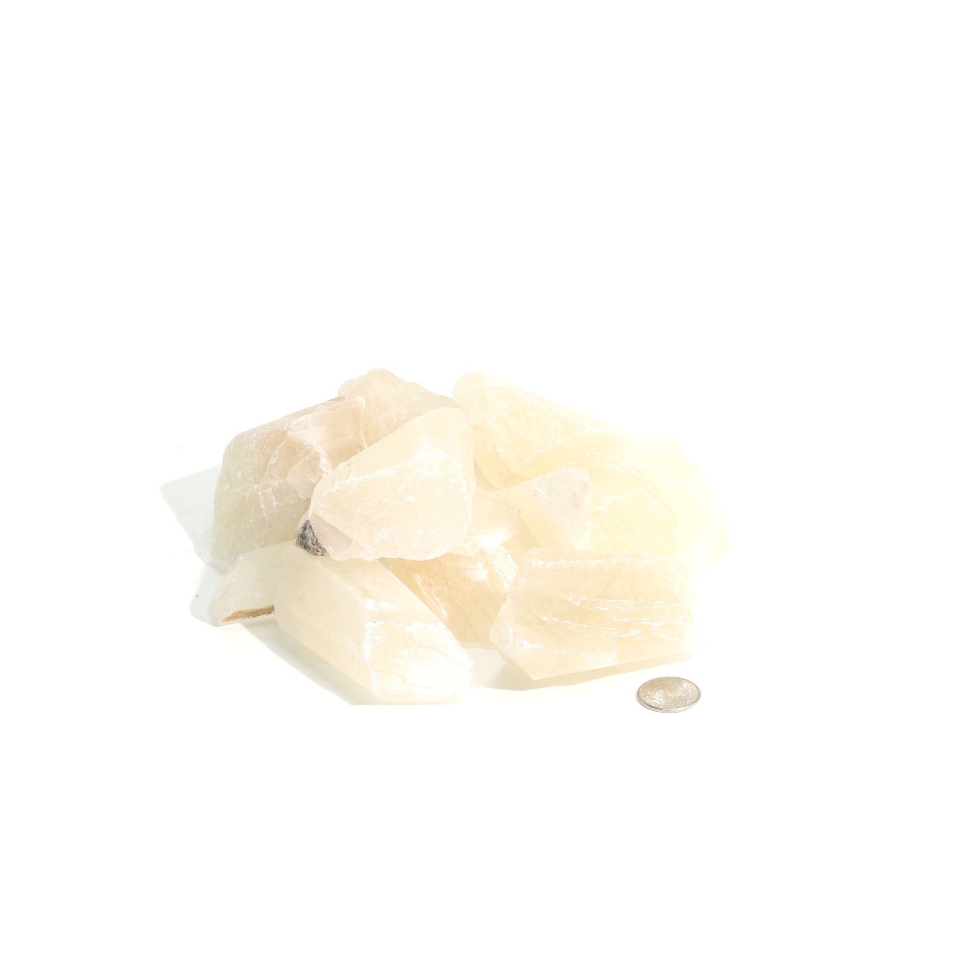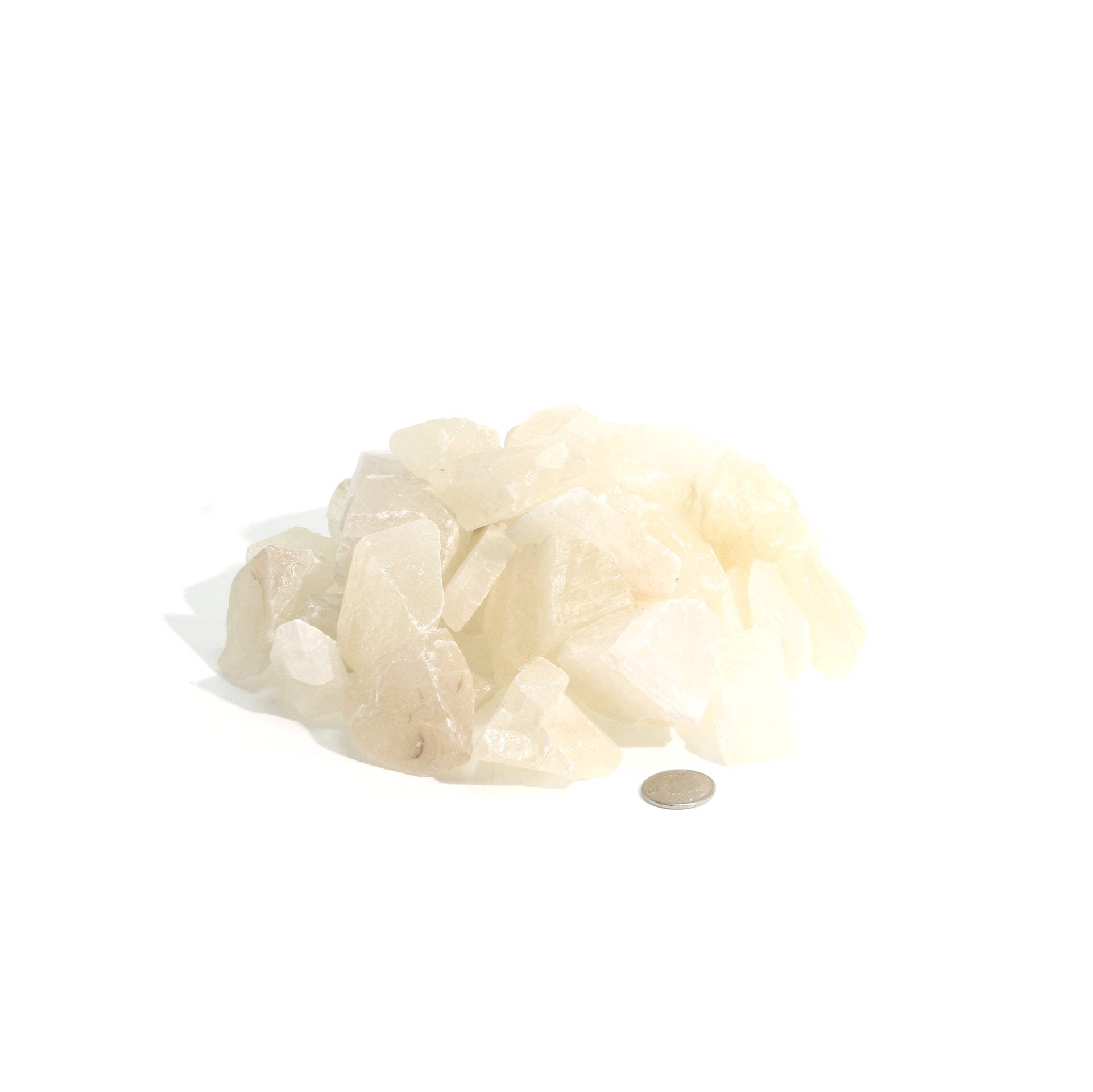 Rough stone white calcite chips display a pearly/chalky white with a pale yellow-grey highlight.