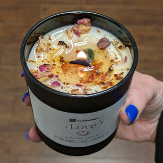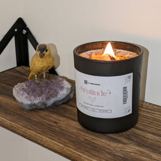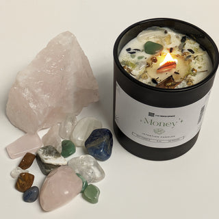Each candle is crafted with natural wax and aromatic oils to set the mood for reflection, release, and renewal. Hidden within are real crystals chosen to match your intention, each one amplifying your focus as the flame dances.