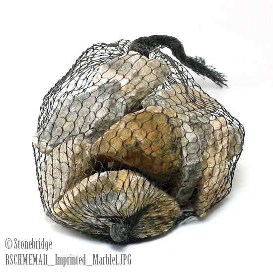 Imprinted Marble Crystal Chips Mesh 500g bag (1” to 3”) Approximate number of pieces per bag: 10 to 20 Gemstone crystals perfect for tumbling, cabbing and collecting.