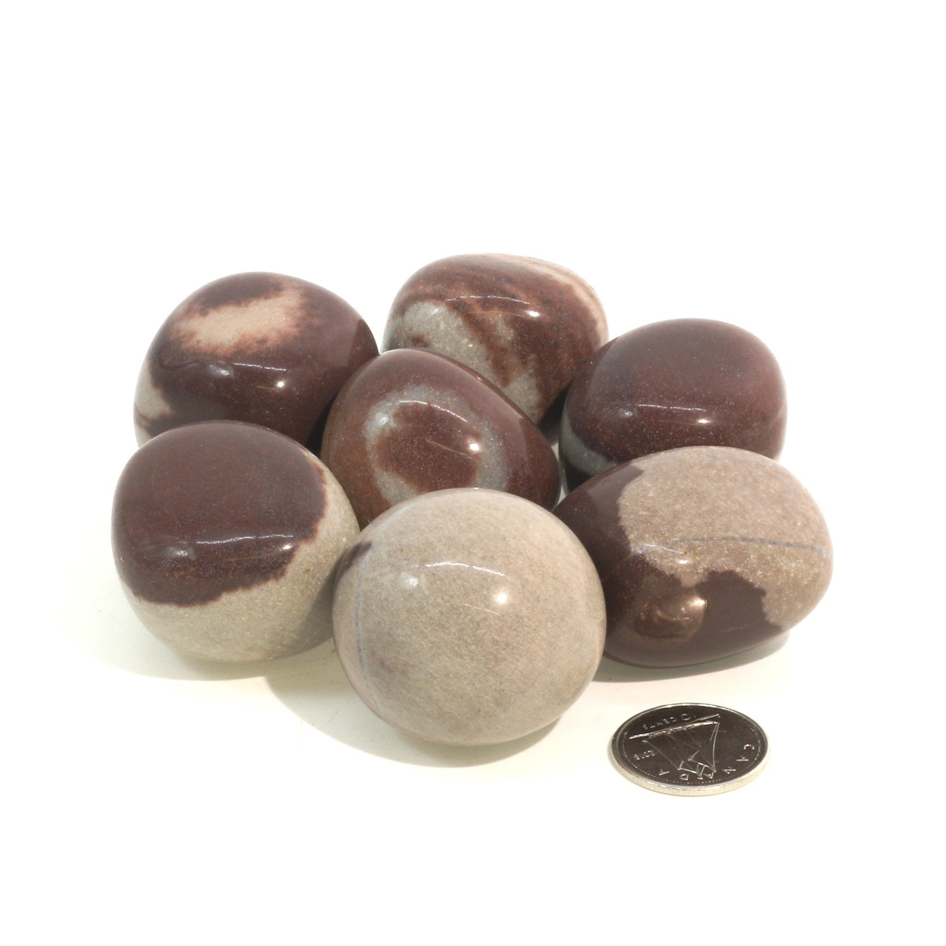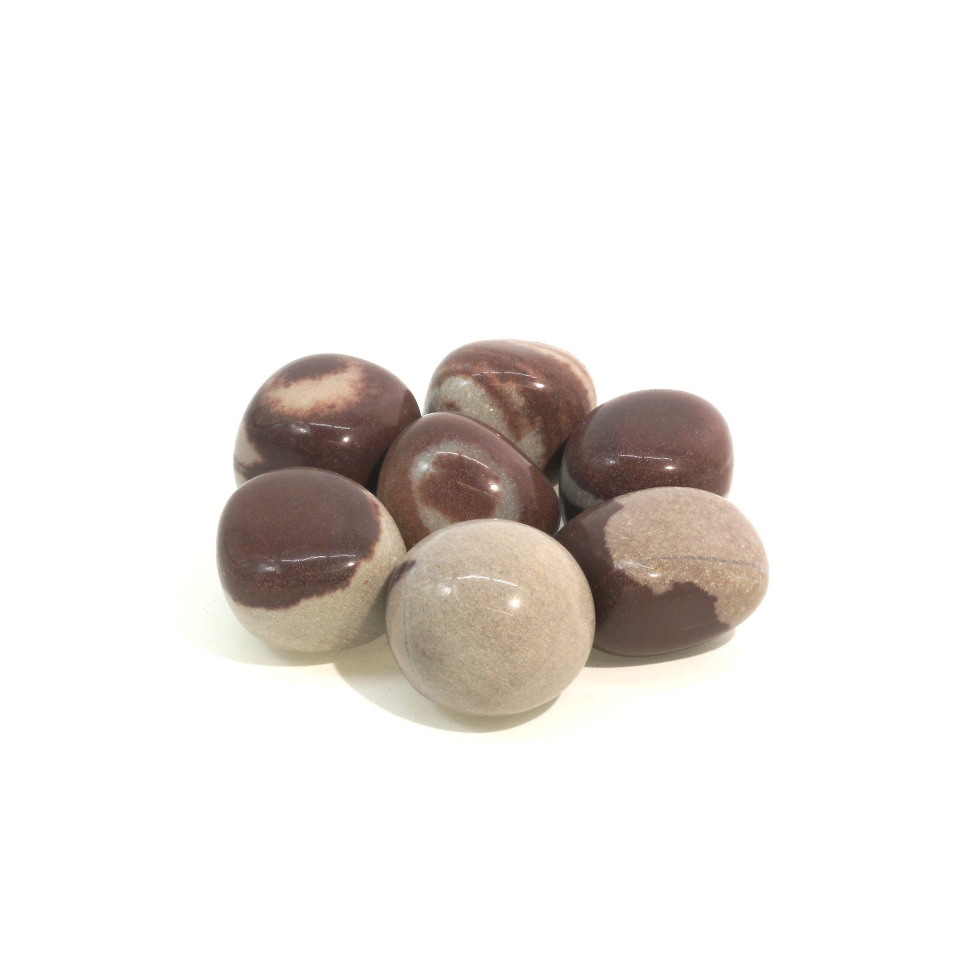 Each Narmada Shiva Lingam Tumbled Stone is carefully handpicked and tumbled to enhance its smoothness and natural beauty. These stones exhibit unique markings, patterns, and shades of brown, making each piece one-of-a-kind. The size of the tumbled stones varies, typically ranging from approximately 3/4" to 1" inches, allowing for easy integration into various spiritual practices, including meditation, energy healing, and creating sacred altars.