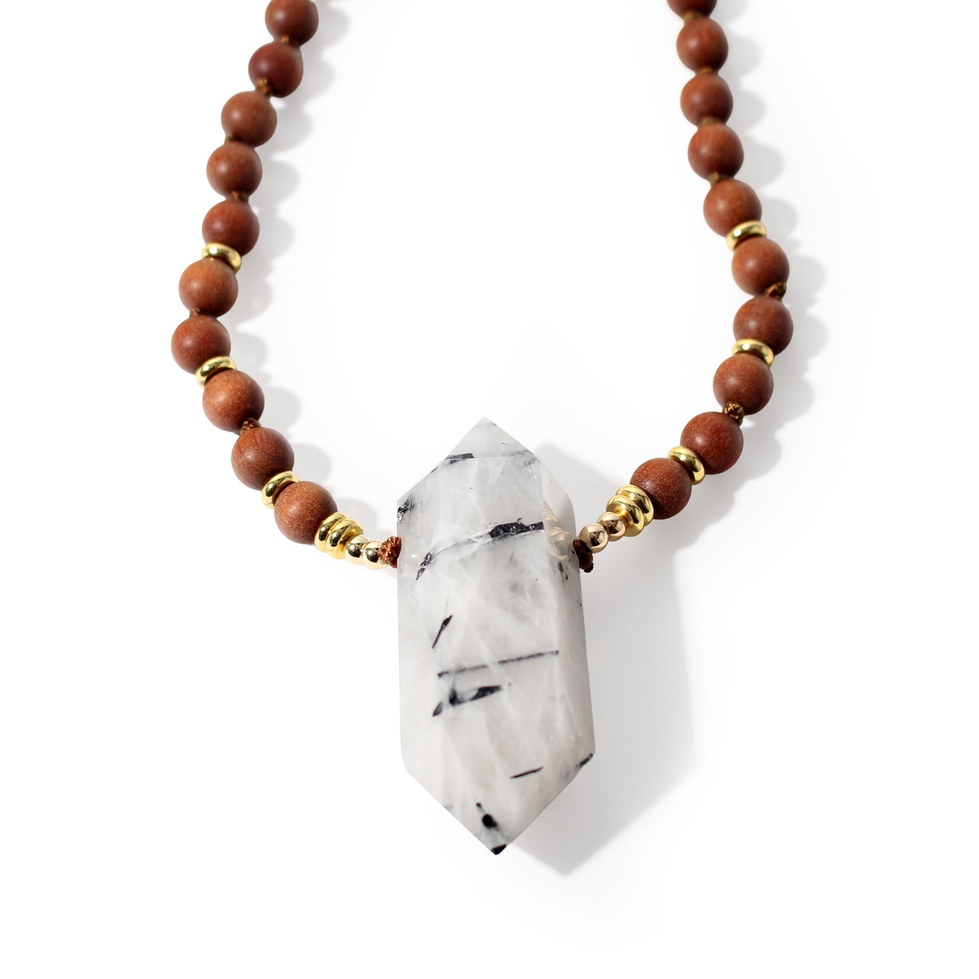Sandalwood is valued for its calming scent and meditative properties. Tourmalinated Quartz, clear quartz with black tourmaline inclusions, offers both amplification and energetic protection, helping to purify and balance your field.