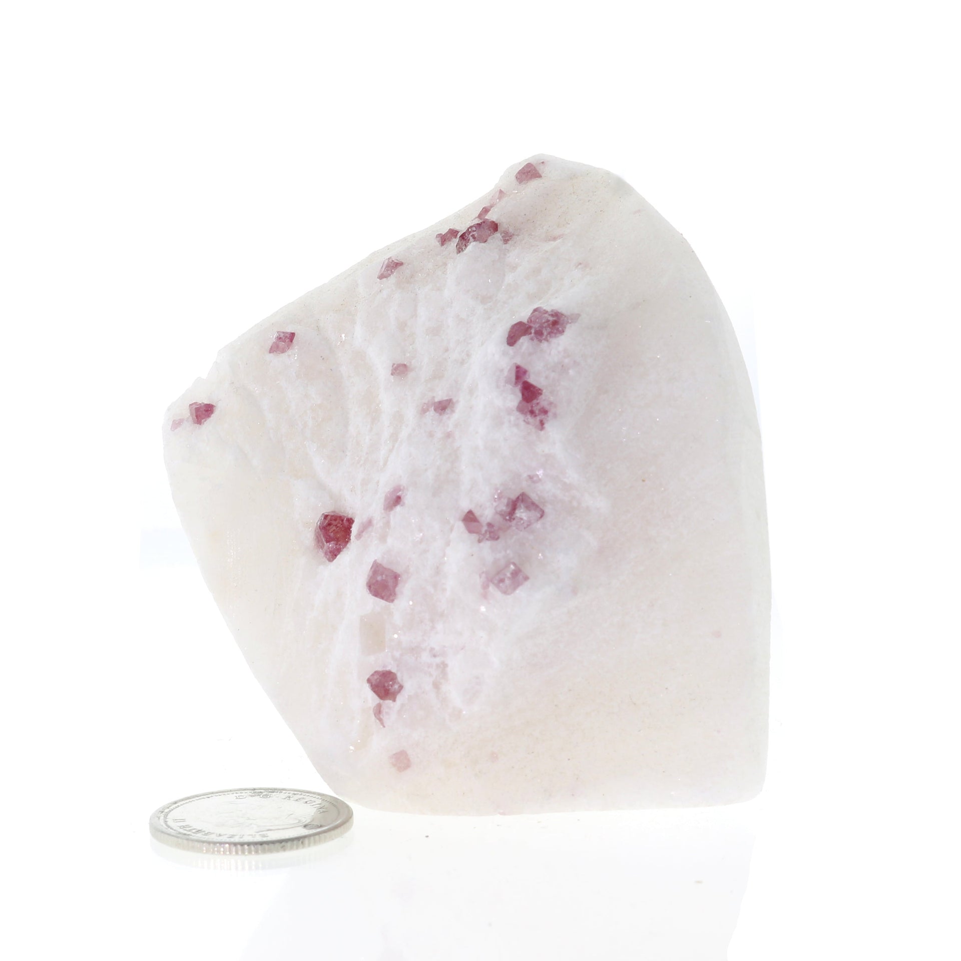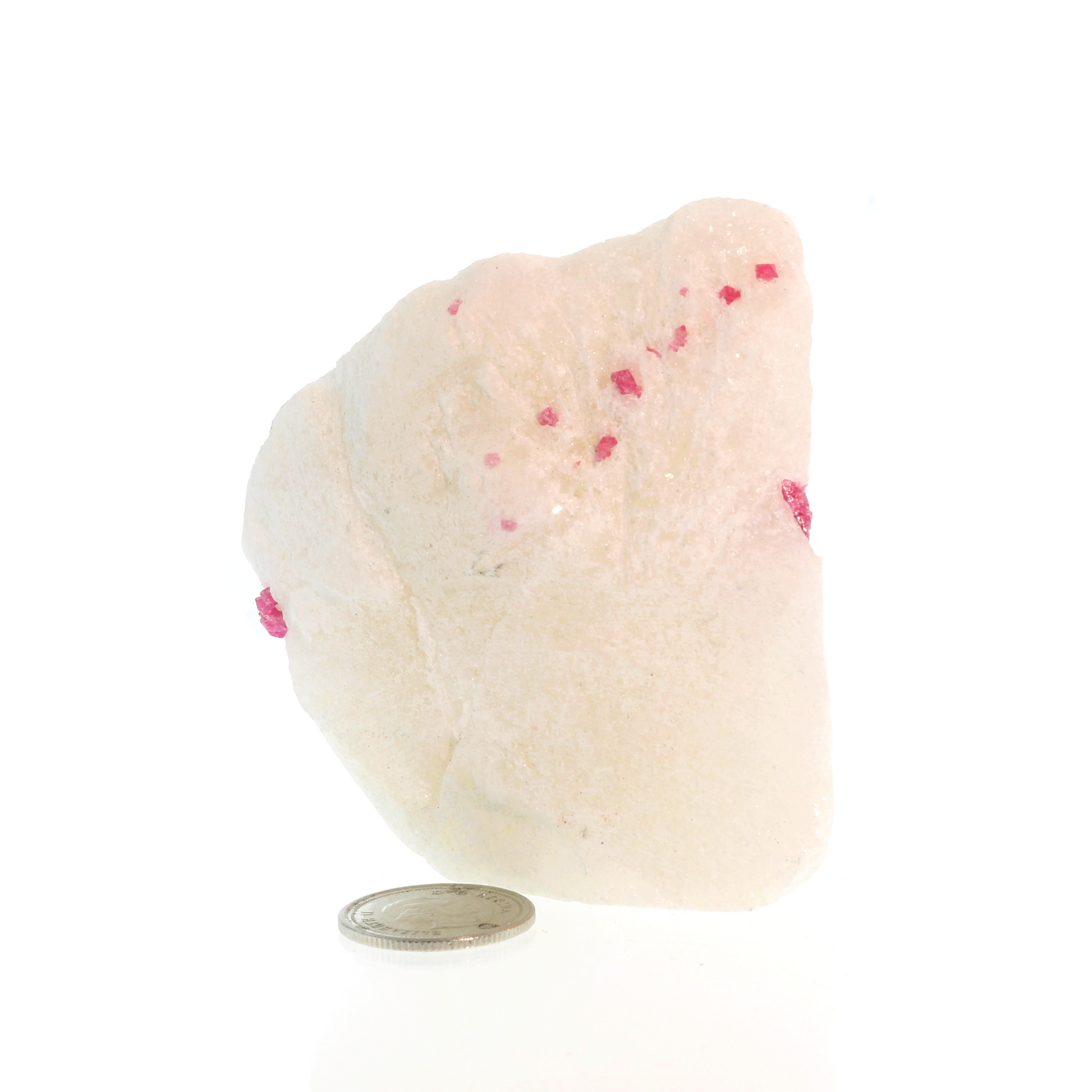 Amazing Pinkish-Red Spinel crystals on snow white Marble. These specimens do hold more than one spinel crystal within its white marble matrix custom made with a cut base for display purposes. The size of this specimen allows us to hold the crystals easily in the hand.