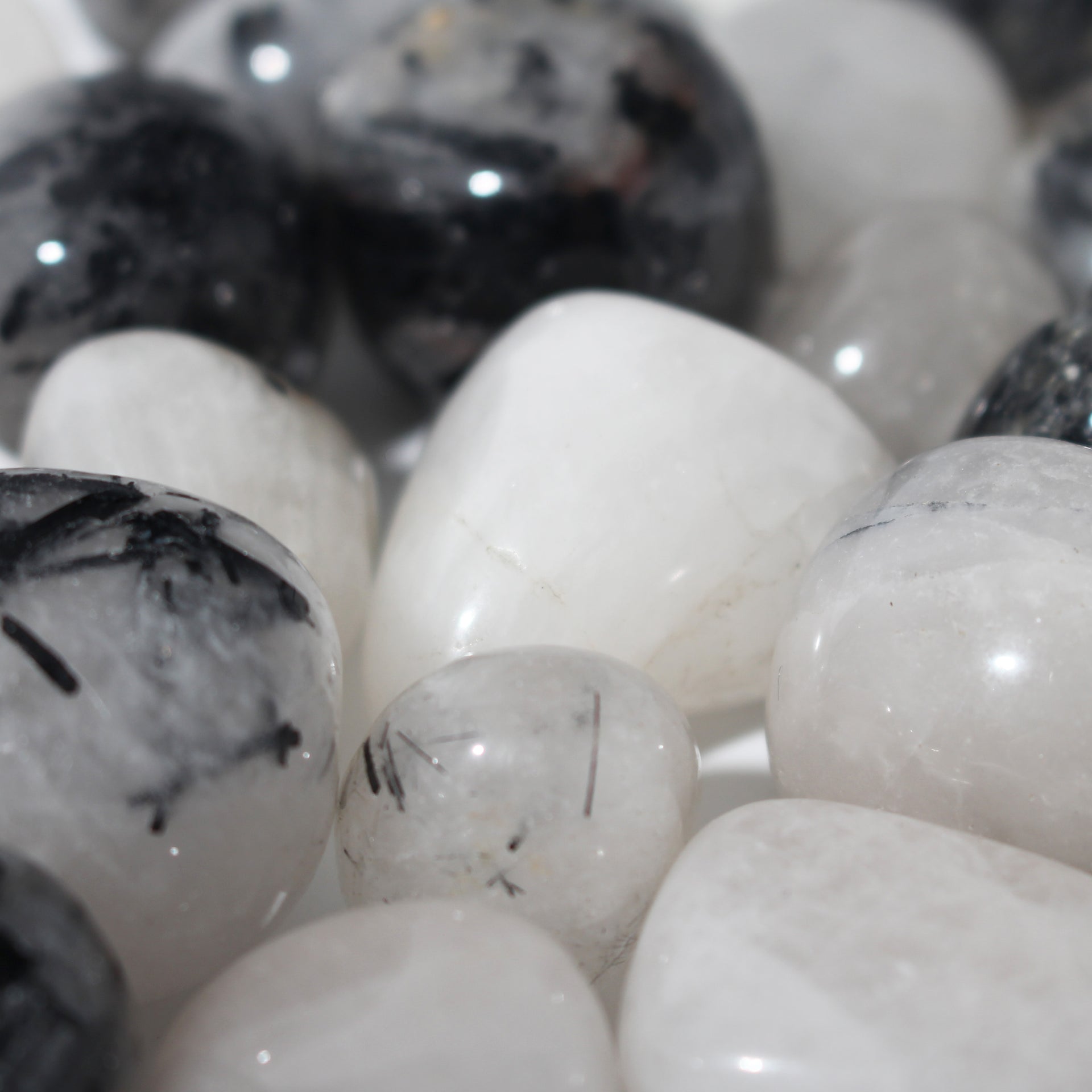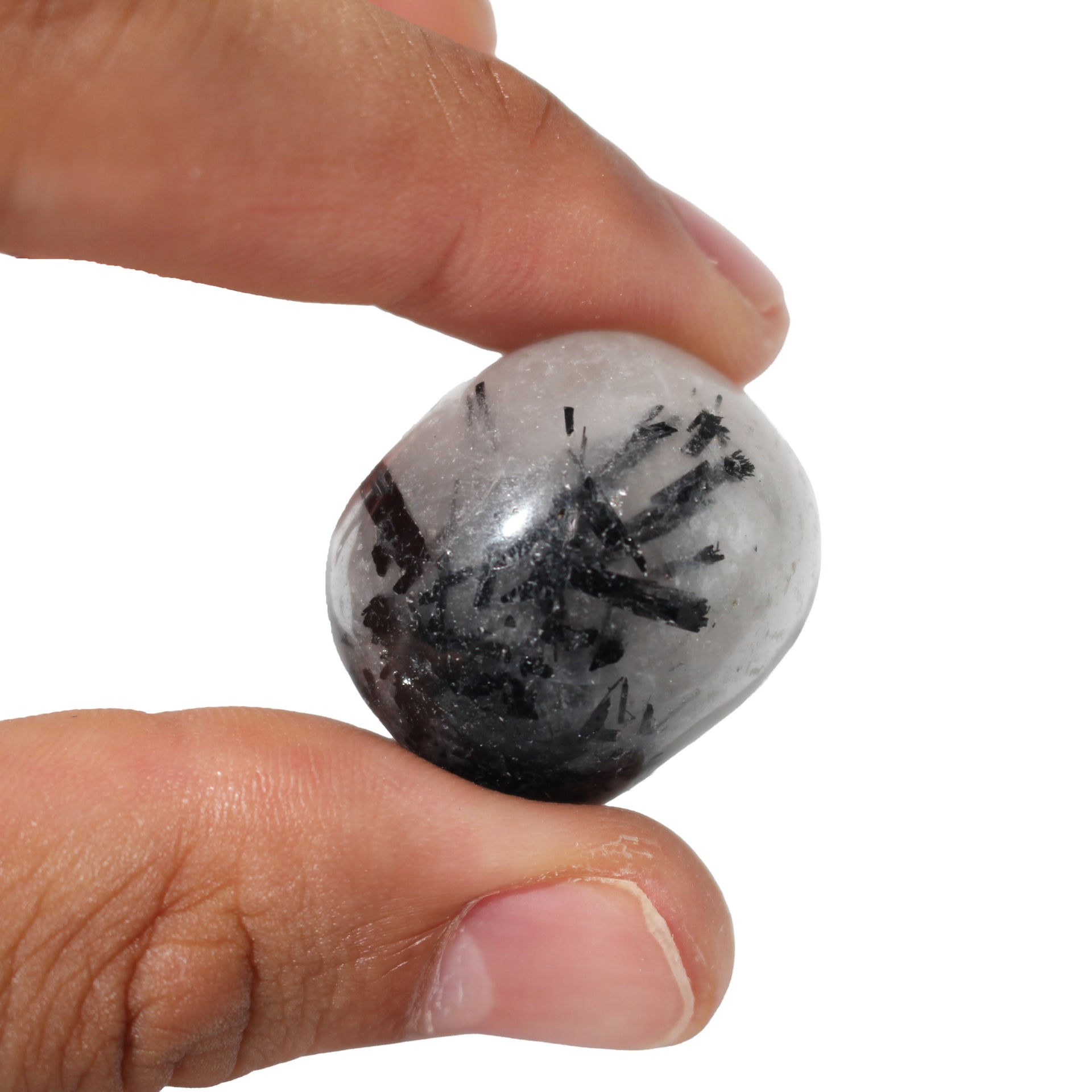 These Tourmalinated Quartz Tumbled Stones feature clear to milky Quartz threaded with fine black Tourmaline inclusions, polished smooth for a dynamic, grounding feel. Each piece blends clarity with protection.