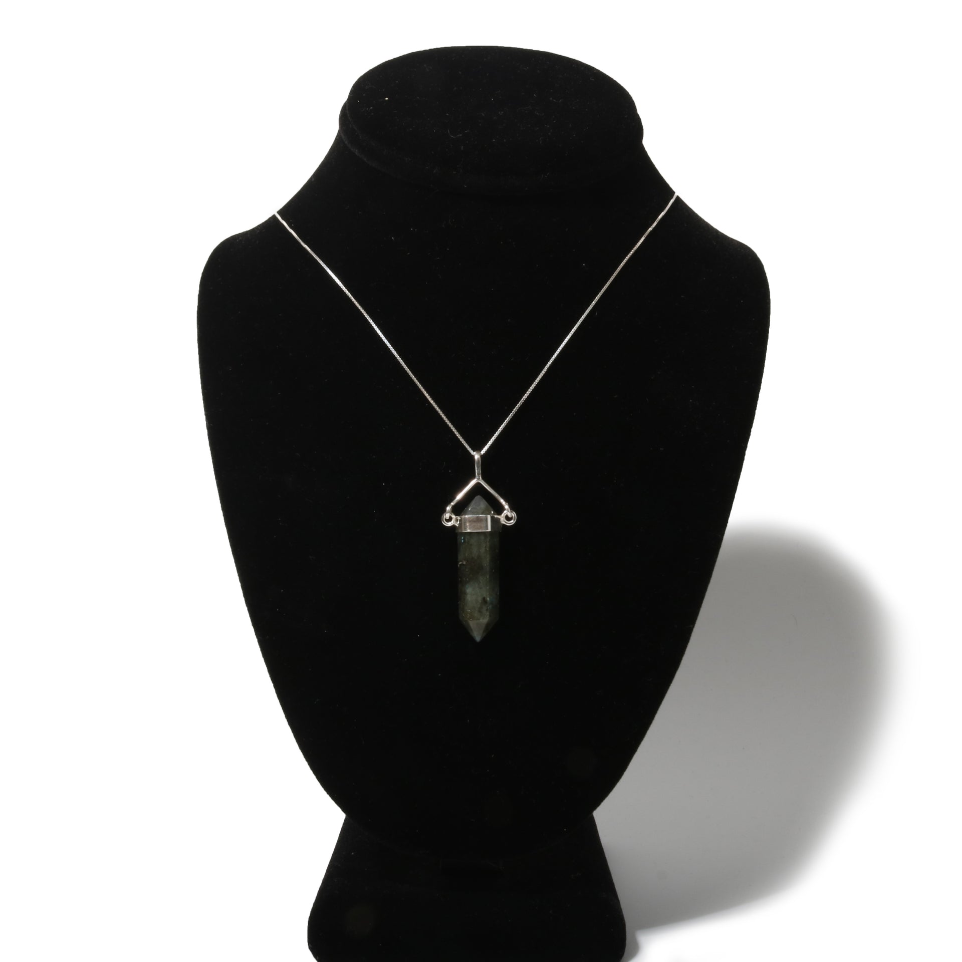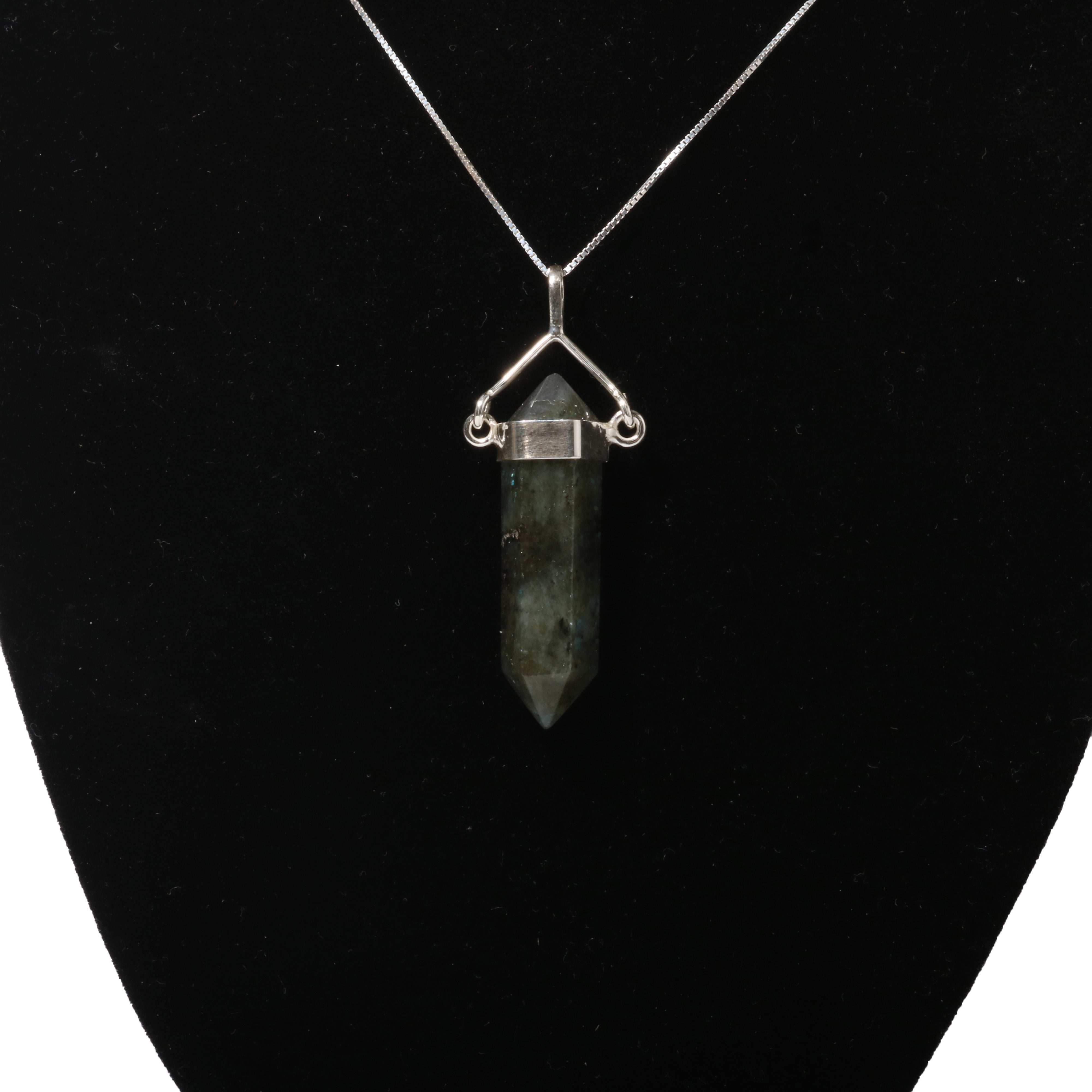 This unique pendant features a double-terminated Labradorite crystal, expertly set in a swivel silver frame that allows the stone to rotate freely, showcasing its spectacular labradorescence from every angle.