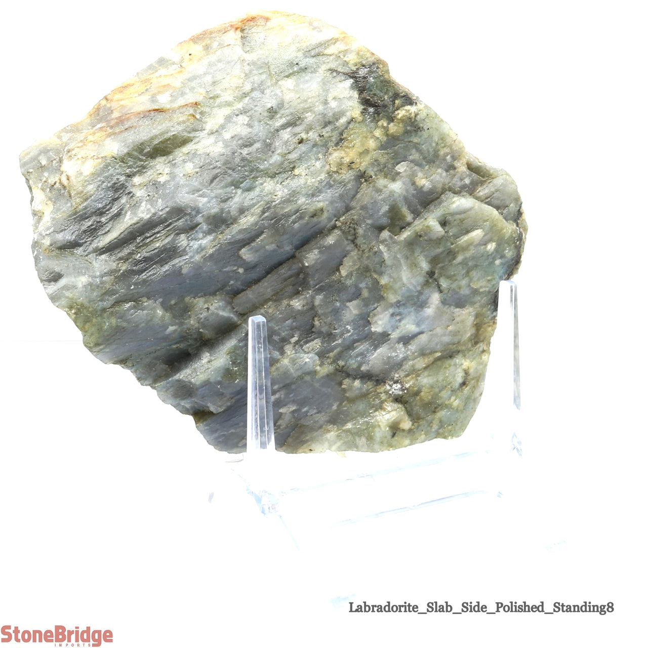 Labradorite Standing Slice with one face polished Slice of labradorite that stands tall with one face polished to show the stone’s beautiful natural colours. The polished face on this piece shows a sparkle of pastel blue-green colours with rainbow pattern on the corner. The back of the piece reveals more of the stone’s natural texture which consists of slate-like arrangements and deep blue-green colouring.Note: The stand on the product is used for photographic purposes only and doesn’t come with this piece as it already stands on its own.