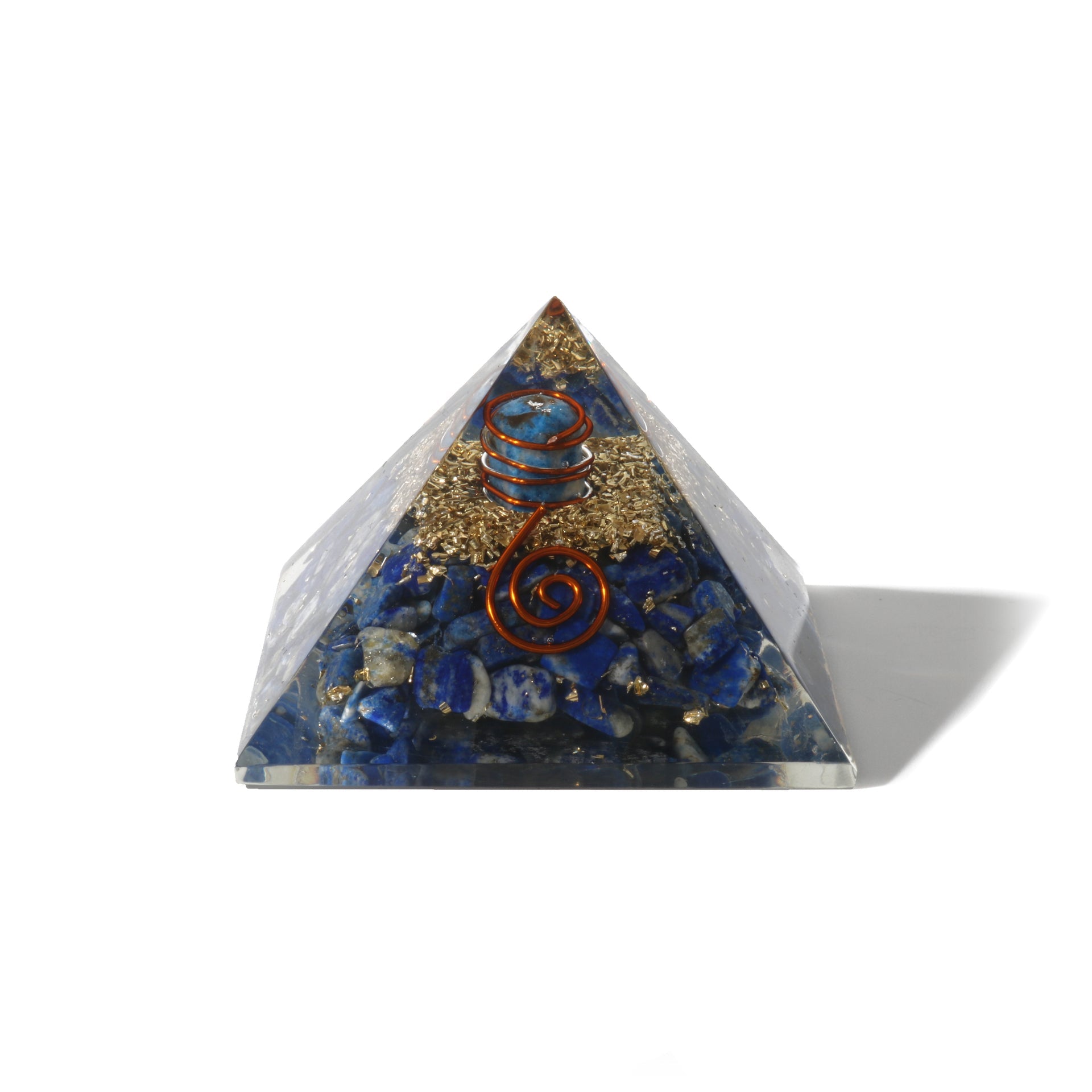 Unlock the gates to higher wisdom and authentic expression with our Lapis Lazuli Orgone Pyramid, crowned with a splendid Lapis Lazuli point. This exquisite pyramid combines the celestial beauty and profound spiritual energies of Lapis Lazuli, a stone revered for its ability to enhance insight, awareness, and truth, with the harmonizing and protective properties of Orgone. The result is a powerful spiritual tool designed to encourage self-awareness, foster intellectual clarity, and protect against negative energies.