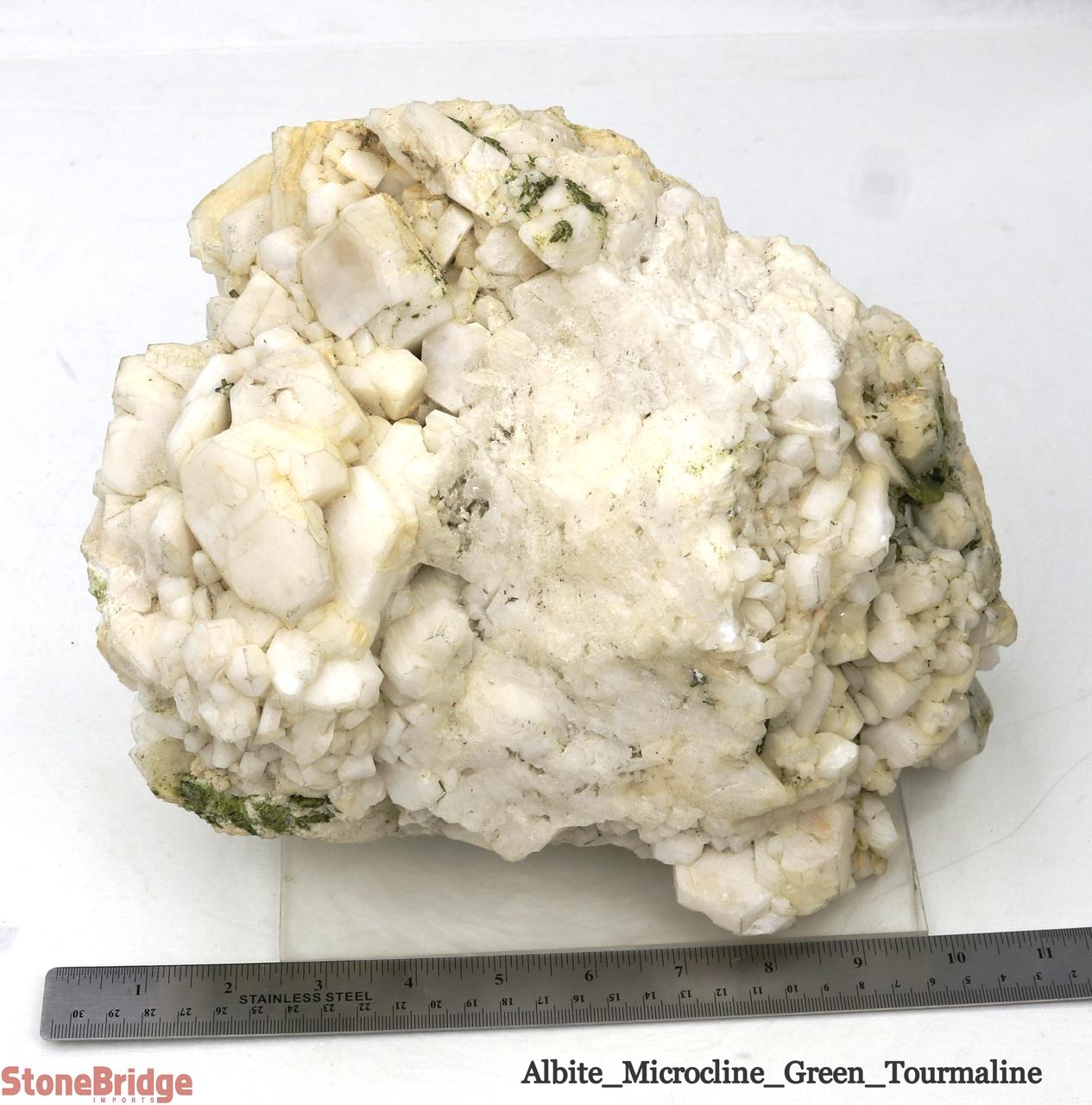 Albite Stone Specimen - Unique #17 Albite is a feldspar that forms a variety of crystals. In its microcline form, such as in the specimen here for sale, albite forms blockly blades. This microcline cluster is chalky white and shimmers under the light. There are few areas on it where green tourmaline encrusts the microcline as an encrusting layer. This specimen is a magnificent structure that draws admiration from any observer. A truly unique piece to own. Note: This product is fairly brittle and must be handled with care.