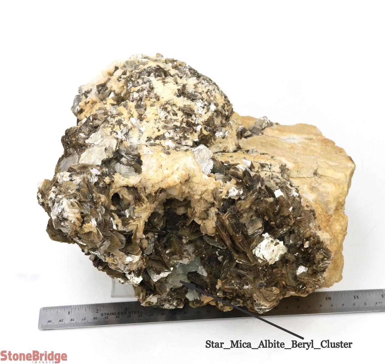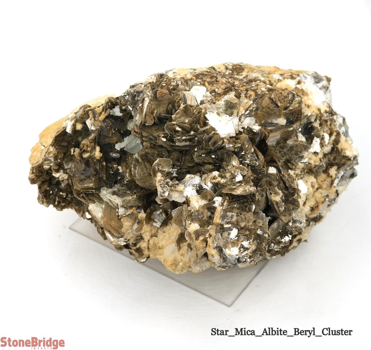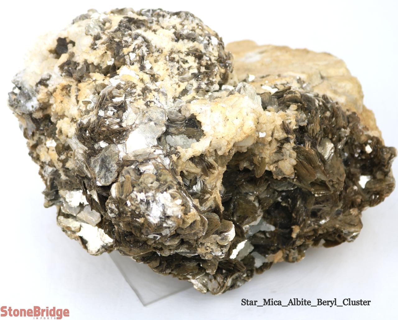 Albite Stone Specimen - Unique #8 Albite is a type of feldspar that is known for accompanying many types of crystals, such as quartz, mica and tourmaline. The specimen for sale has a light brown colouration, large mica blades, and a few small beryl crystals growing among the mica. This piece is a very interesting specimen and will intrigue any observer. Note: This product is fairly brittle and must be handled with care.