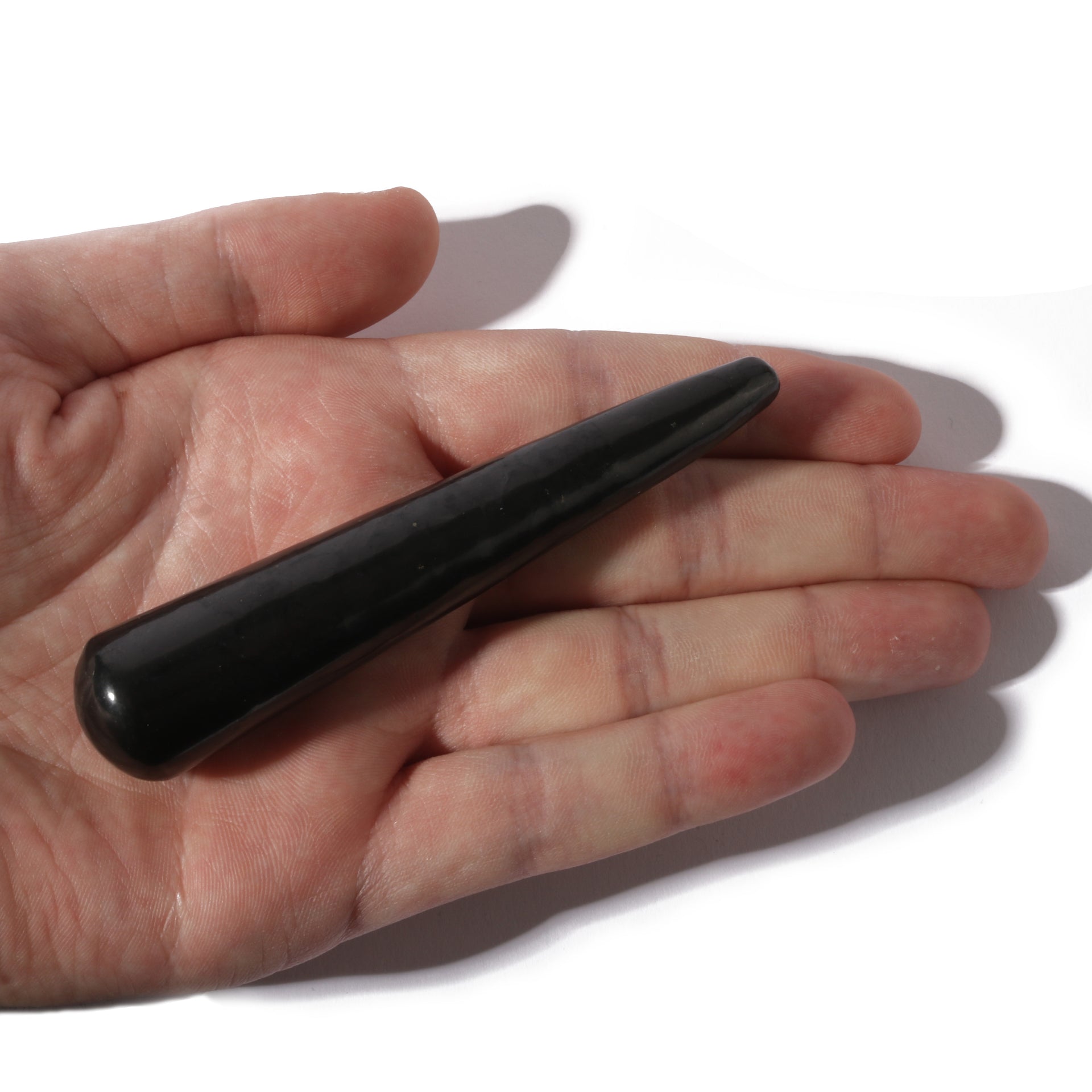 Shungite Massage Wand Information: Colour: Black, Silvery-black Lustre: Matte, metallic Brief Description: It is estimated by scientists that shungite is almost 2 billion years old. It’s appearance reminds one of coal, it is found in very ancient layers of the Earth’s crust that were formed before life forms existed on Earth. Shungite is sometimes called the “Stone of Life” due to it’s healing and antibacterial properties. Many people use shungite to create a healing spa in the home by placing it in some water to purify and charge the water with cleansing energy. Mythology: Shungite has been used in medical treatment since the early 18th-century. Peter the Great set up Russia’s first spa in Karelia to make use of the water purifying properties of shungite, which he had himself experienced. He also instigated its use in providing purified water for the Russian army. The anti-bacterial properties of shungite has been confirmed by modern testing. Shungite has been used since the middle of the 18th-century as a pigment for paint,and is currently sold under the names “carbon black” or “shungite natural black”. In the 1970s, shungite was exploited in the production of an insulating material, known as shungisite. Shungisite is prepared by heating rocks with low shungite concentrations to 1090-1130 °C and is used as a low density filler. Usage: Shungite is said to calm and relax anyone using or near it. This may be due to its protective energies and rejection of negative energy. Shungite is used in crystal healing and local folk healing to heal immune system, hair growth, kin diseases and deformations, antioxidants, fight free radicals, cancer, rheumatic arthritis, osteoarthritis, musculo-skeletal disorders, liver disease, kidney disease, GI problems, headaches, insomnia, balancing blood pressure to ideal level, respiratory issues, anti-inflammatory, anti-bacterial, pain relief, rapid healing and more. It is considered by many to be a miracle healing stone. Metaphysical Properties: Shungite is a powerful stone to shield you from the electro-magnetic radiation given off by electrical equipment… including computers, mobile phones, microwaves and televisions. It may be in a variety of shapes including spheres or pieces of stone that have been carved in pyramids… as well as pendulums. Any type of shape can be utilized for this purpose. It has been the unique properties of this stone that got the attention of scientists… particularly the fact that it contains fullerenes. This stone is the only known natural source of fullerenes… so this has made the scientists who have been testing it extremely interested in, not only its properties… but how mankind can use it. Fullerenes are being investigated for many industrial uses and some of these are quite interesting. Some of the uses they hope to use Fullerenes for in the future are: in makeup to stop UV damage, as part of solar electric generating devices in place of silicone.... and as a future part of techniques to help allergic conditions, including asthma. Healing Properties: Healing the lower energies that many still carry and are lodged with the auric field needs to happen and this is where Shungite comes through as a healing aid. Acting as a catalyst for positive change and growth, Shungite will spur one on and forward towards total healing of the physical, emotional, mental and spiritual bodies. The demands of time and energy will